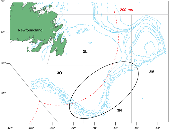 Fig. 1. Chart of the Grand Banks NAFO Div. 3LNO. Spanish bottom trawl area in NAFO Regulatory Area, Div. 3NO, is marked by the ellipse.