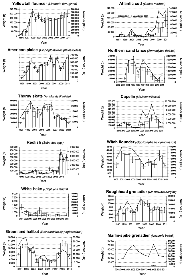 A total of 938 201.77 kg was caught during the 10-years time series (2002–2011), of which 877 874.44 kg were fishes, corresponding to the 93.56% of the total capture, and representing 240 taxa (221 fish species) belonging to 86 families. Species were caught in depths between 38 to 1460 m. The highest catch corresponded to redfish. The most present species (% occurrence) was American plaice. Over the last few years of the studied period, the estimated indices for yellowtail flounder and redfish increased (Fig. 3). In 2011, Atlantic cod and American plaice continued to be below historical levels.