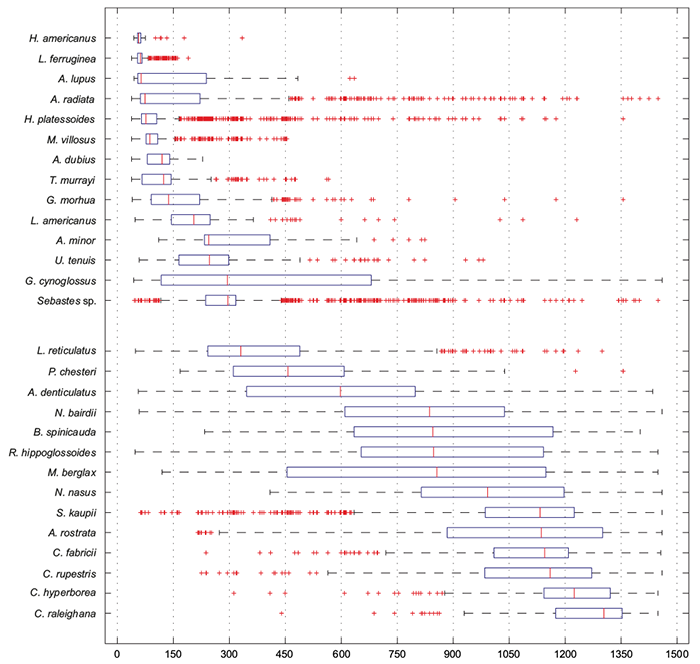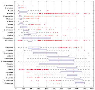 Fish species were not randomly distributed across depths(x2 = 21.67, df = 9, p < 0.01), and showed three different patterns of distribution in relation to depth (Fig. 4). Some species presented a limited shallow distribution (e.g., yellowtail flounder, sea raven, Northern sand lance, capelin, moustache sculpin, Atlantic wolfish). Other species presented wider bathymetric distribution (e.g. witch flounder, Northern wolfish). The rest of the species were restricted to a deep range distribution (e.g. black dogfish, Arctic skate, rat fish). Median depth was less than 300 m for 14 species, between 301 and 1000 m for eight species, and deeper than 1001 for six species.
