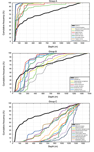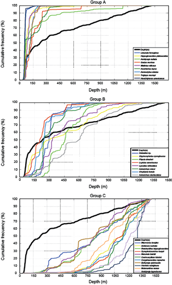 Second analysis was made via empirical cumulative distribution functions for observed depth and depth weighted by the biomass of specimens caught of each species. It was observed that species presented different behaviour with respect to depth. Species appeared divided into three main groups. Some species presented a distribution above the function for depth; those species presented cumulative occurrence percentages higher than 80% in depths less than 300 m. Cumulative distribution of those species was plotted in Fig. 5, group A (Shallow). Other species showed no particular association between fish distribution and depth within the area surveyed. This group comprised species with very different behaviour and variability in a wide range of depth (Fig. 5, group B (Intermediate)). One species, witch flounder, had a random distribution in terms of the depth. Other species presented a distribution below the function for depth, with a cumulative occurrence percentage higher than 80% in depths greater than 1001 m (Fig. 5, group C (Deep)).