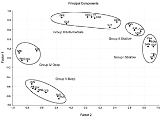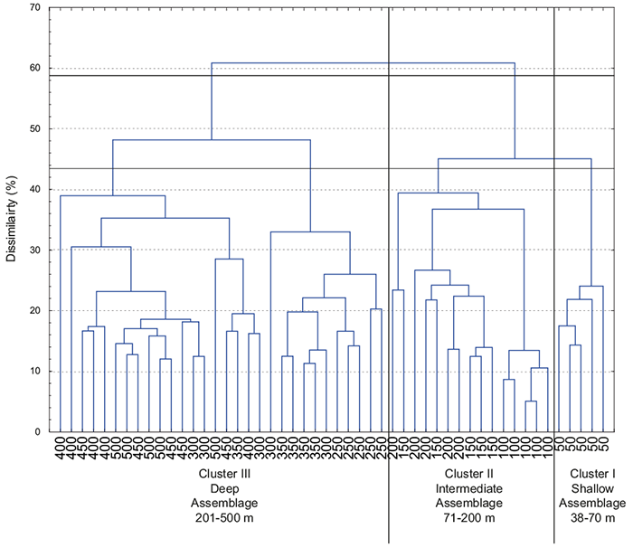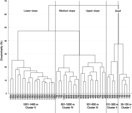 A cluster analysis was performed to contrast these results. The examination of the dendogram revealed the existence of five groups associated with the continental shelf and the slope (Fig. 6). Cluster I and II (Shallow or “Continental Shelf”) comprised the strata with depths lesser than 150 m and between 151 and 300 m; cluster III (Intermediate or “Upper Continental Slope”) contained the depth strata between 301 and 600 m, cluster IV (Deep or “Medium Slope”) the depth strata between 601 and 1000 m and Cluster V (Deep or “Lower Slope”) the depths greater than 1001 m. In agreement with the PS, the dendogram indicated less zonation at the boundaries of 150 m and 600 m because the boundaries in these depths appeared at a low level of dissimilarity (37% and 28% respectively).