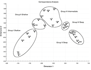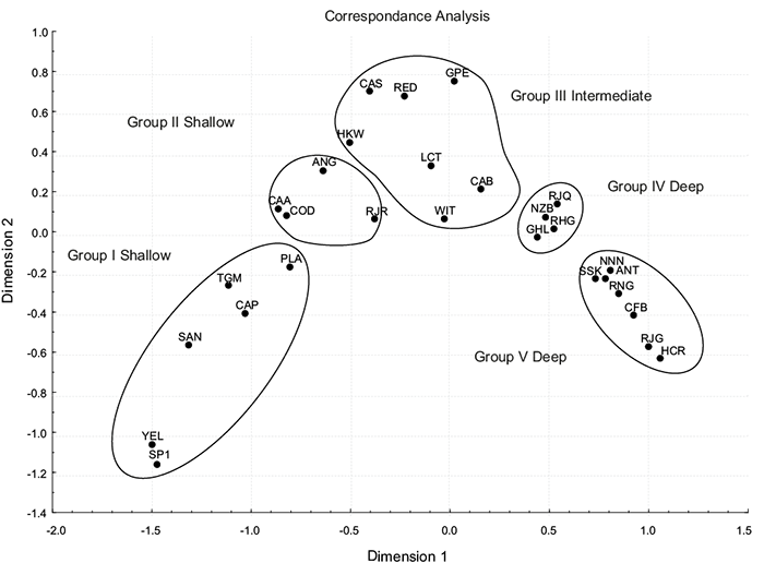 From these analyses, five assemblages appeared: Shallow assemblages comprised first Shelf Group I (comprising sets shallower than 150 m) and second Shelf Group II (comprising sets between 151 and 300 m); Intermediate assemblage (Upper Continental Slope) Group III, comprising sets between 301 and 600 m; Slope Group IV between 601 and 1000 m and Deep assemblage (Continental Slope) Group V, comprising sets deeper than 1001 m. The three main groups: Shallows, Intermediate and Deeps agree with the three different patterns found in the cumulative distribution.