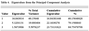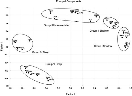 Correspondence Analysis (Fig. 7) showed five different groups in agreement with the five clusters of the dendogram. In the Principal Components Analysis (Fig. 8), the first three principal components accounted for 84% of the variation in fish assemblage structure (and had eigenvalues >1.0, Table 4), with the first two components accounting for more than 79%. We found five groups of species, which were the same as in the CA.