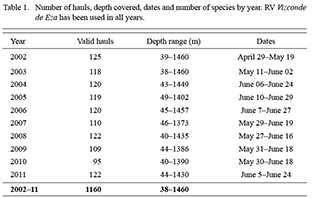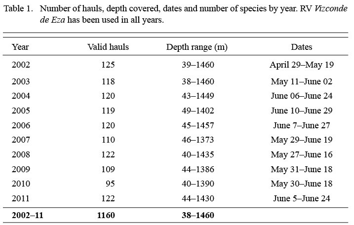 We used data from the Spanish Survey conducted by the Instituto Español de Oceanografía (IEO) to estimate abundance and biomass of demersal resources in the Div. 3NO of the NAFO Regulatory Area. This survey has been carried out every year since 1995 in late spring (May–June). From 1995 to 2001, it was conducted on board the CV Playa de Menduiña using the Pedreira–type net, and, since 2002, the RV Vizconde de Eza has replaced the former vessel in conducting surveys using a Campelen bottom trawl. In 2001, a comparative survey between the two vessels was made in order to transform the historic time series into the new vessel index, making 92 paired hauls. The survey indices of the most important species were transformed to use the whole time series in the assessments of these species. For details of the indices transformation, see Paz et al. (2002). In this study species that are not usually assessed have been used, although the transformation of their indices is not available. For this reason we used data from 2002 to 2011 (Table 1). Hauls were made following the stratification charts described in Bishop (MS 1994). Sets were allocated in accordance with the area of the strata, with a minimum of two planned hauls per stratum. Trawl positions were chosen randomly. Abundance and biomass for all species were estimated by the swept area method (Cochram, 1997). The sampling unit consisted in 30-minute hauls at a speed of 3.0 knots using a Campelen 1800 otter trawl gear. The mesh size was 44 mm for the net and 12 mm for the cod end. The mean horizontal opening was 26 m and the vertical opening was 4.1 m. The otter trawl was monitored using a Scanmar net control system. For temporal series details see Paz et al. (2002). Around 120 valid hauls are made each year. In each haul all the individuals caught are systematically sorted by species and the length distribution is obtained (González–Troncoso et al., 2004). The mean of the initial and final depth has been used to define the bottom depth of each haul. The mean depth varies from 38 to 1460 m. A total of 1160 hauls were made in the survey between 2002 and 2011 (Table 1 and Fig. 2).
