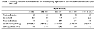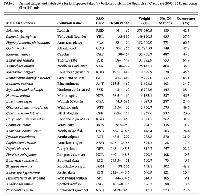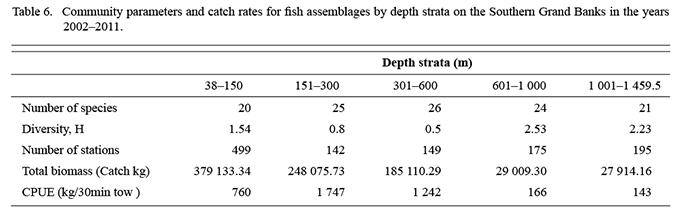 In the area of the Grand Banks of Newfoundland, different fish assemblages at depths from 40 to 500 m have been described by Gomes et al. (1992). Similar fish assemblages were also defined by Paz and Casas (1996) and González-Troncoso et al. (2006) in Flemish Cap. Although bathymetric ranges in those studies were different and dramatic changes in abundance and biomass of species caused changes in dominant species of assemblages, we observed a persistence in the main features of the assemblages over the time.