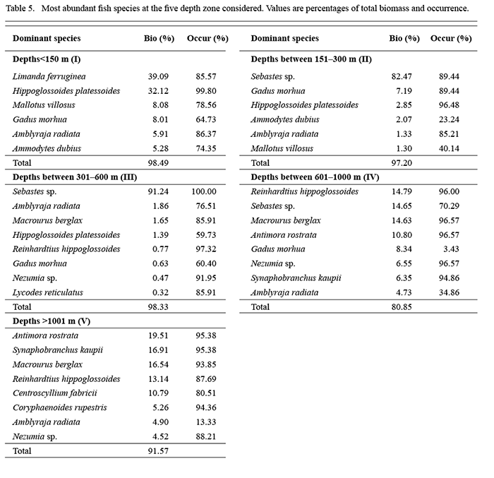 In assemblage I, yellowtail flounder and American plaice were dominant with an occurrence higher than 85%; redfish was the dominant species in assemblage II with a very high proportion of biomass in comparison with the proportion of others species in the same group. In this assemblage, Atlantic cod and American plaice had a very high occurrence, more than 89%, although their percentage of biomass is very low (less than 10 times redfish biomass). In group III, redfish was also the dominant species in terms of biomass but Greenland halibut and marlin spike had an occurrence higher than 91%. In assemblage IV, Greenland halibut and roughhead grenadier were the dominant species. In group V, blue hake was the dominant species, although Northern cutthroat eel and roughhead grenadier reached similar biomass and occurrence values.