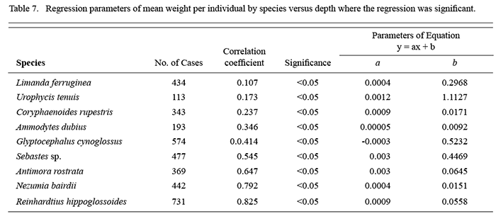 The “bigger-deeper” phenomenon, in general, refers to the distinct trends in body size over environmental gradients. As a general rule, there is a positive relationship between size and depth. Intra-specific bigger-deeper trends have been identified in Collins et al. (2005) and in previous works (e.g. Macpherson and Duarte 1991). To analyze the bathymetric trends of demersal fishes, regressions on individual species were performed. Size was estimated from the mean weight of the species at each set.
