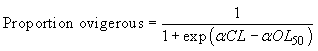 where α is a constant and OL50 is the length at which 50% of female crabs are ovigerous.