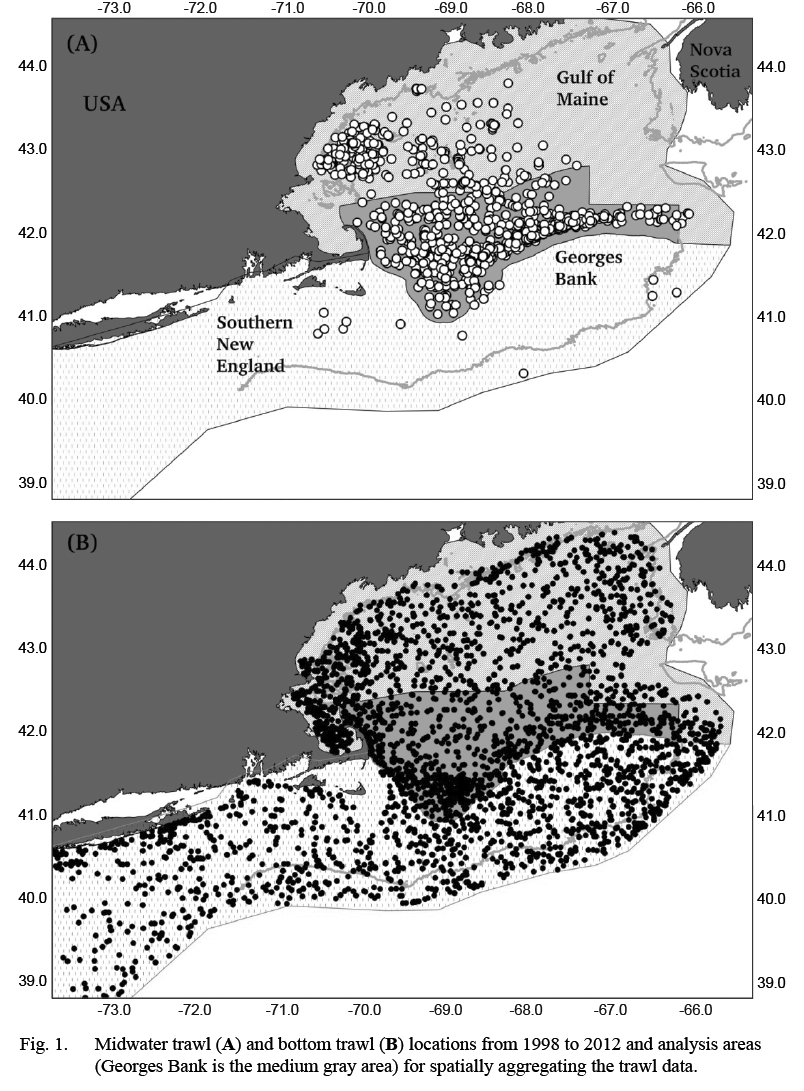 There was ample spatial overlap between midwater and bottom trawl hauls in the Georges Bank area, less so in the Gulf of Maine, and very little overlap in southern New England (Fig. 1). The majority of midwater trawl hauls were clustered in the Georges Bank area, with clusters of sampling in the Jeffreys Ledge (approximately 43o N 70o W) and the mid- to western portion of the Gulf of Maine. Only eleven midwater trawl hauls were conducted in southern New England from 1998 to 2012. In contrast, the bottom trawl hauls were fairly homogeneously distributed throughout the continental shelf north of the mid-Atlantic region. The clusters of bottom trawl hauls in the Great South Channel (approximately 41.5o N 69o W) and Cape Cod Bay (approximately 42o N 72.5o W) were due to comparison tows between the AL IV and HB that were limited in space and time.