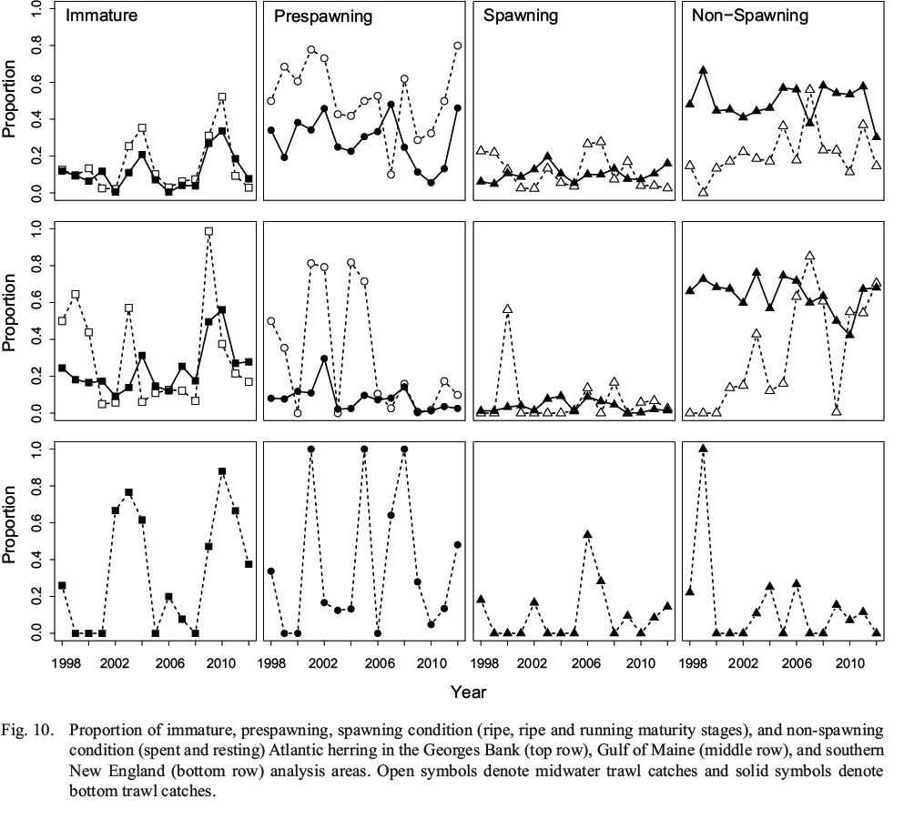 In the Georges Bank region, midwater trawl catches had greater proportions of Atlantic herring in prespawning condition and bottom trawl catches had greater proportions of adult herring in non-spawning condition in all years except 2007; and bottom trawl catches had greater proportions of herring in spawning condition in 9 of the 15 years (Fig. 10). Those trends were similar in the Gulf of Maine with greater proportions of prespawning herring caught in midwater trawls and greater proportions of adult herring in non-spawning condition caught in bottom trawls. In the Gulf of Maine, midwater trawl catches showed greater proportions of prespawning herring prior to 2006, whereas there were greater proportions of adult herring in non-spawning condition after 2006. Both midwater and bottom trawl catches in the Georges Bank region and bottom trawl catches in the Gulf of Maine showed peaks in the proportion of immature herring in 2004 and 2010. In the Gulf of Maine, proportion of immature herring in midwater catches peaked in 1999, 2003, and 2009, which except for 1999 were one year prior to peaks in the Georges Bank region; but peaks of immature herring in bottom trawl catches in the Gulf of Maine coincided with those in the Georges Bank area. Bottom trawl catches in southern New England had high proportions of immature and spawning condition herring and low proportions of adult non-spawning herring throughout the years.
