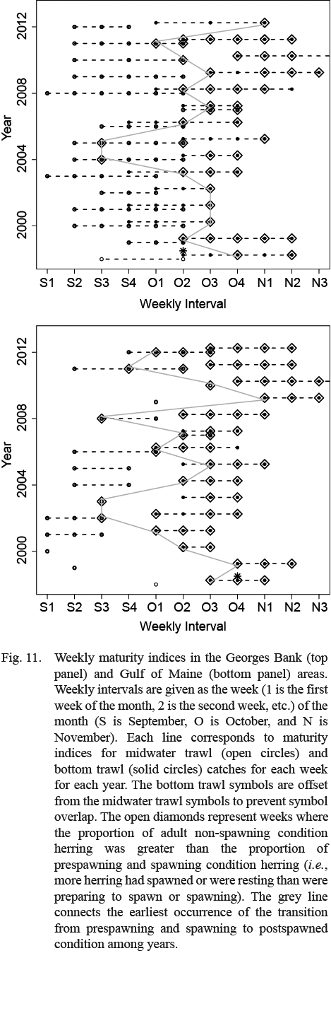 The index of spawning timing suggested peak spawning occurred from September into early October (Fig. 11). In the Georges Bank region, the transition from prespawning and spawning condition herring to postspawned herring tended to be during the second and third week of October, with some transitions occurring in September. In general, once the transition occurred, the proportion of postspawned herring dominated, but in some years (e.g., 2005), the transition occurred multiple times during the spawning season. In the Gulf of Maine, the transition tended to be earlier than in the Georges Bank region, with transitions occurring in late September and early October (Fig. 11).
