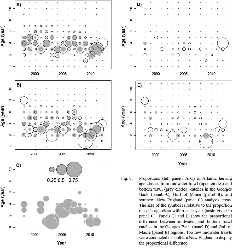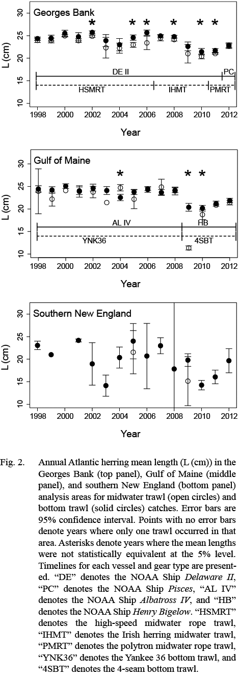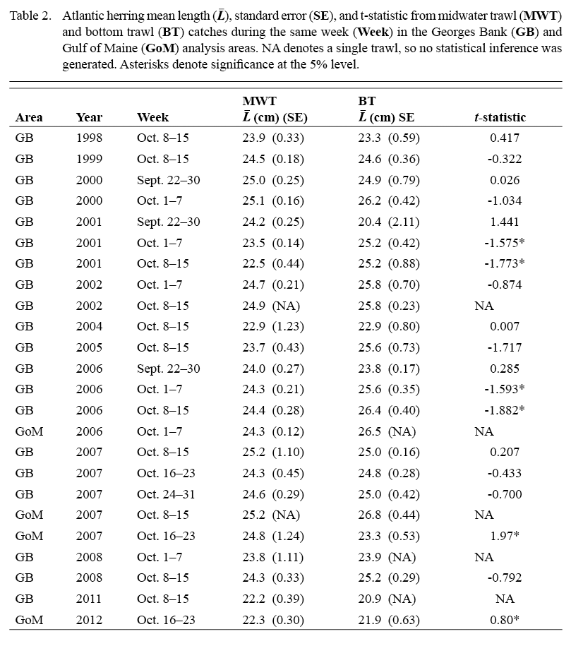 The overall similarity of biological metrics between midwater and bottom trawl catches suggests both gear types provide comparable samples of the core demographics (length, weight, age, maturity) of Atlantic herring in the Georges Bank and Gulf of Maine regions in autumn. Our results indicate that each data set can be used separately or combined, for example in cases where neither survey provides sufficient spatial or temporal coverage. Within analysis areas, annual mean lengths and weights and temporal patterns of herring size were consistently similar between gear types. Historically, there was concern that a bottom trawl may not adequately sample a pelagic species such as Atlantic herring (TRAC, 2012) (Overholtz et al., 2006) and in the absence of quantitative information, catchability among gear types have been set to 1 (Anonymous, 2012) or allowed to be a free parameter in assessment models (NEFSC, 2012). This study does not investigate catchability per se, but is the first comparison of demographic information from fisheries-independent bottom and midwater trawl sampling of Atlantic herring in the Georges Bank and Gulf of Maine regions, and to our knowledge the first comparisons of bottom and midwater trawl catches of Atlantic herring. Whether these similarities can be extended to other areas and time periods (e.g., overwintering in the mid-Atlantic) remains to be investigated. There is evidence that bottom and midwater trawls can provide comparable biological data (e.g., Pillar and Barange, 1995). In a series of papers, Stockwell et al. (2006; 2007) and Yule et al. (2007; 2009) showed substantial differences in abundance and biomass estimates of a semi-pelagic species in Lake Superior between bottom trawl and acoustic/midwater trawl surveys, yet length distributions were consistently similar between gear types.