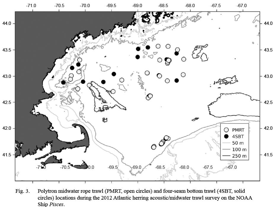 Atlantic herring (Clupea harengus) in the Gulf of Maine, Georges Bank, and southern New England regions have been sampled from early September into November by the Northeast Fisheries Science Center during their annual stratified-random bottom trawl survey (Politis et al., 2014) and dedicated systematic acoustic/midwater trawl survey of Atlantic herring (Overholtz et al., 2006). The dedicated herring survey was an acoustic and midwater trawl survey designed to systematically sample prespawning aggregations of herring in the Georges Bank and Great South Channel area of southern Gulf of Maine as well as historical spawning sites in the Gulf of Maine. This survey was conducted annually from 1998 to 2012 covering approximately the same areas during late September into mid October (Jech and Stroman, 2012). This survey was established to determine if a dedicated herring survey could provide age-based abundance measures (Jech and Sullivan, 2014) for stock assessments. The bottom trawl survey is a stratified-random design, multi-species survey that begins near Cape Hatteras, NC in early September and enters the Gulf of Maine in mid to late October (Azarovitz et al., 1997). It is the primary fisheries-independent survey conducted in the Northeast United States for stock assessment purposes (Anonymous, 2012).