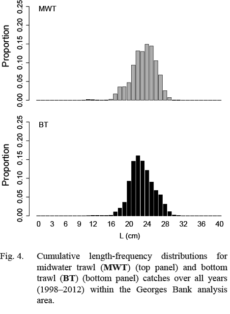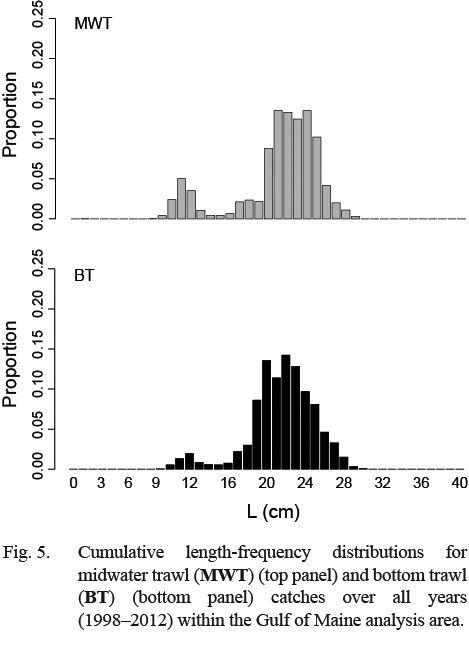The uneven length-stratified subsampling potentially affects summary statistics of biological subsamples (e.g., Morgan and Hoenig, 1997; Morgan, 1999). For example, because larger individuals were sampled more intensively, a simple mean of ages will potentially be biased towards older ages. To account for the uneven subsampling, maturity, age, and weight (of biological subsamples) were scaled by the length distribution for each midwater and bottom trawl catch and then compared to means using all individuals within the subsamples. Scaling by the length distribution assumes the length distribution is representative of the herring assemblage and that the biological variables are scalable by length.