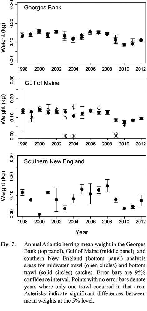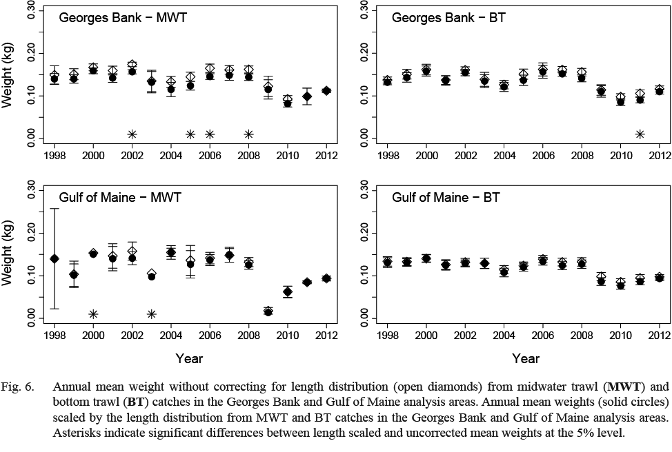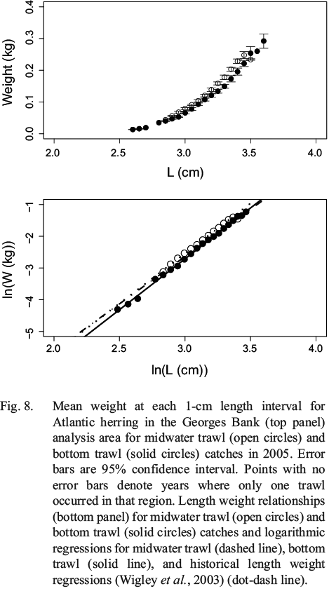 where Wj is individual weight at each fork length interval, and n(FL) is the number of individuals at each sub-sampled length interval. For mean weight-at-length, it is not necessary to scale by the length distribution as the weight-at-length is standardized by taking the mean. In order to calculate a mean weight for the trawl catch from the subsampled data, the scaled mean weight of an individual herring for each trawl haul was calculated by scaling the mean weight-at-length by the length distribution (similar to scaling of maturity and age samples). These scaled mean weights were compared to length-weight relationships derived from the data and those used by the NEFSC (Wigley et al., 2003).