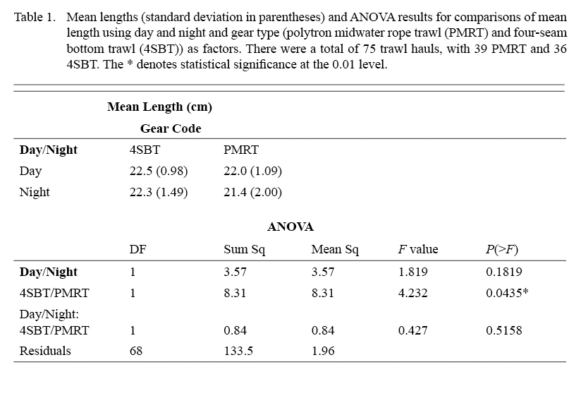 A total of 75 trawl hauls, 39 PMRT and 36 4SBT, were conducted as part of the gear comparison (more midwater trawl hauls were completed, but were not used for this analysis) during the Atlantic herring acoustic/midwater trawl survey in 2012. Analyses of mean lengths showed similar results to those from the entire surveys, with statistically longer herring (ANOVA, p<0.01) caught in the 4SBT than in the PMRT (Table 1). Mean lengths were not statistically different between day and night for either gear type.
