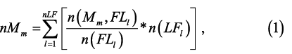 where nMm is the number of individuals at the mth maturity stage (M) scaled for oversampling at larger length intervals, l indexes length, n(LFl) is the number of individuals at the lth length interval, n(Mm, FLl) is the number of individuals of the mth maturity stage at the lth FL from the subsample, and n(LFl) is the total number of Atlantic herring individuals biologically subsampled at the lth FL (sensu Morgan and Hoenig, 1997). There were 40 length intervals n(LFl), 1 to 40 cm) and 6 maturity stages. The unknown maturity category (“X”) was excluded from analysis to be consistent with the bottom trawl survey which seldom used the code (48 occurrences of more than 10 600 individuals measured), and the herring assessment (NEFSC, 2012). nMm is divided by the total number of individuals in the length frequency distribution (NT) for the proportion of each maturity stage in each trawl haul (PMm)