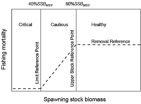 The DMF introduces a Removal Reference (Fig. 1), typically expressed in terms of F, which prescribes the maximum acceptable harvest rate for the stock in each of the three SSB Zones. F in the Healthy Zone must be less than or equal to the harvest rate associated with maximum sustainable yield (FMSY) and in the Cautious Zone, there must be a progressive decline in F with decreasing stock status. A Harvest Control Rule (HCR) determines the change in F. Below the LRP, the harvest rate, taking into account discards and landings, must be kept to an absolute minimum. The specific harvest rate required when the stock is below the LPR is undefined in the DMF but subsequent assessments of some stocks have shown that it can include both bycatch and directed fishing.