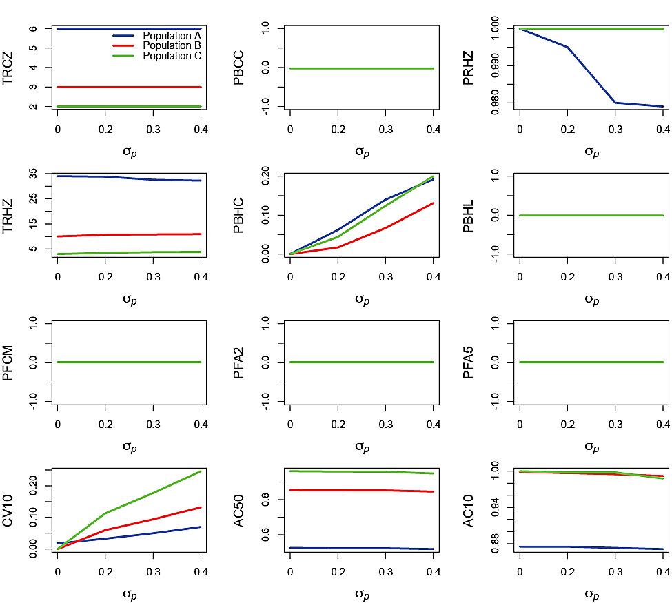 Minimum and maximum values for all performance statistics across all runs in which the PHCR was applied (i.e.. excluding F = 0 runs; data in Tables 2, 3 and 4) showed that TRCZ had a range of 6.00 to 7.18 years for Population A and less than one year for Populations B and C (Table 5). The range in PBCC was less than 0.05 for all three populations. PRHZ had a minimum that was population dependent, being lowest for Population A (0.78) and highest for Population C (close to 1.0). TRHZ had a wide range, more than 6 years for Population A, about 6 years for Population B and about 3.5 years for Population C. Maximum values for PBHC were close to 0.2 for Population A, close to 0.25 for Population B and about 0.3 for Population C. PBHL had a small range and was less than 0.04 for all three populations. The range in PFCM was population-dependent and was widest for Population C with a maximum of about 0.7 and smallest for Population A with a maximum of about 0.25. Maximum values of PFA2 and PFA5 did not vary much across populations with values of about 0.2 to 0.3 for PFA2 and about 0.1 to 0.2 for PFA5. CV10 had a wide range within each population but with a maximum value that was fairly similar across all three populations (0.6–0.68). Maximum values for AC50 were population-dependent with a narrow range within each population. AC10 had an even narrower range within each population.