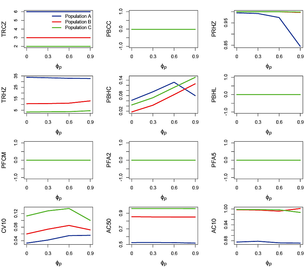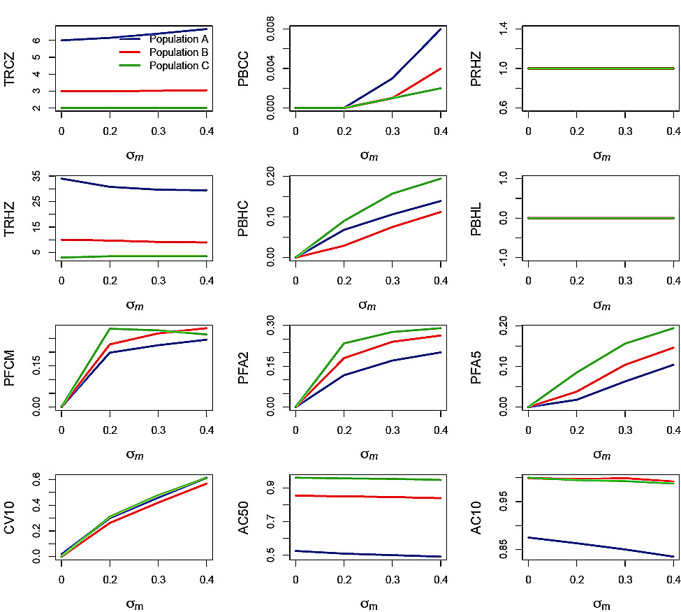 Performance statistics for the simulation trials in which the PHCR was applied under measurement error-only are plotted against σm (Fig. 5) and ϕm (Fig. 6). Recall that measurement error was only applied to SSB. The effect of increasing σm was apparent in all the performance statistics, with the exception of PRHZ and PBHL (Fig. 5). However, the effect was very small on TRCZ and AC50. PBCC increased with increasing σm for all three populations but remained very small overall. TRHZ decreased slightly with increasing σm for Populations A and B. PBHC increased with increasing σm in all three populations, from 0 at σm = 0 to nearly 0.2 in Population C, greater than 0.1 in Population A and about 0.1 in Population B, at σm = 0.4. The three F-based performance statistics increased with increasing σm and were greatest for Population C, intermediate for Population B and least for Population A. The exception was for PFCM, where the effect on Population C declined at σm = 0.3 and σm = 0.4, ending up below the corresponding value for Population B. Probabilities reached as high as 0.3 for PFA2 and 0.2 for PFA5 in the case of Population C while values for the other populations were lower. CV10 increased with increasing σm for all three populations and were around 0.6. AC50 and AC10 decreased slightly with increasing σm, particularly in the case of Population A.