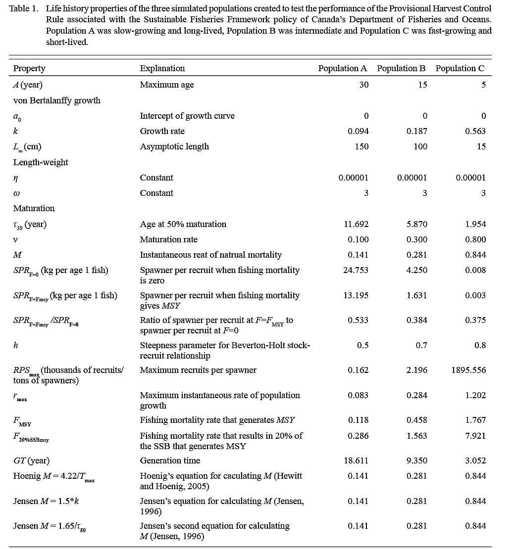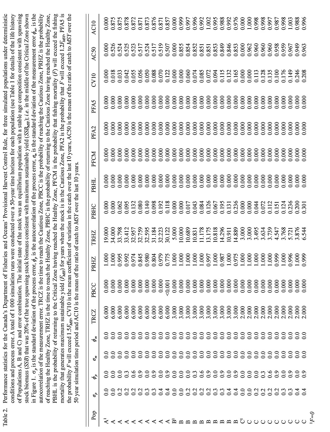 The objective of the present study was to evaluate the general performance of the PHCR for three simulated hypothetical fish populations with different life histories and under a range of assumed process and measurement errors. Performance criteria for evaluating the PHCR were developed from the DMF’s management objectives with regard to SSB, F and catch. This study is considered preliminary because it was not stock-specific and did not implement a full closed-loop management strategy evaluation (MSE) that includes simulating the actual stock assessment process; widely acknowledged as the preferred approach, but one that would have to be stock-specific (Cox and Kronlund, 2008; Punt et al., 2014).