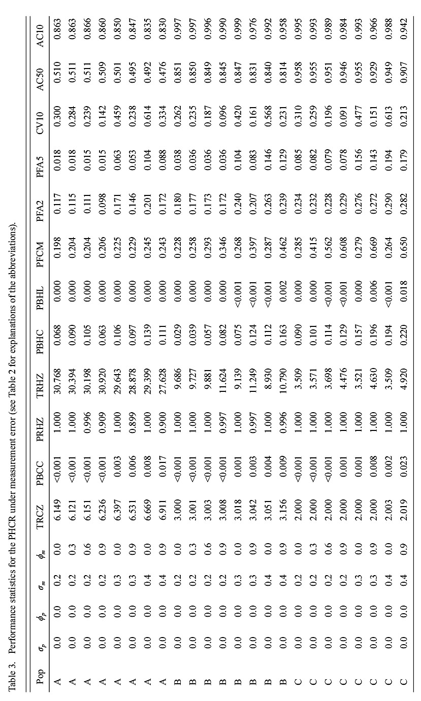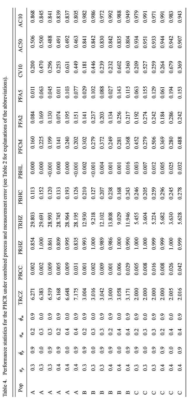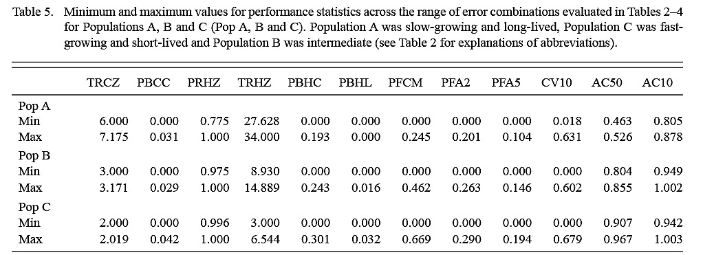 Performance statistics for the simulation trials in which the PHCR was applied under deterministic conditions and process error-only (Table 2) measurement error-only (Table 3) and combined process and measurement error (Table 4) showed considerable variability in some cases, dependent on life history and error combination. In other cases, performance statistics were found to be insensitive to the range of errors examined.