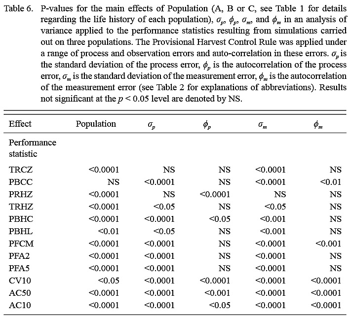 In this study, initial trials of the robustness of the PHCR were explored under a range of process errors and measurement errors for three simulated depleted populations with different life histories. Life history had a significant effect on nearly all performance statistics selected for evaluating the PHCR. Both process and observation errors, and to a lesser extent autocorrelation in these errors, had significant effects on many of the performance statistics selected. However, in several cases, the range of values obtained under different error combinations was small (<10%). It should be noted that a danger in the application of ANOVA on simulation results is that any variable with a non-zero effect size can be found to be significant if enough simulations are run. Responses for some of the performance statistics were not consistent across populations. This is attributed to life history differences and the relative impact of autocorrelated errors. For example, the decline in PBHC in the slow-growing, long-lived simulated population, at the highest levels of ϕp and ϕm, was caused by interactions between the lagged response by SSB to variation determined by life history and autocorrelation in the errors, which in the case of ϕm, was mediated through changes in F by the PHCR. The performance of the PHCR would change if time lags in the application of the PHCR were considered. Typically data from y – 1 is used in year y to provide scientific advice for year y + 1, resulting in a two-year lag between data for the terminal year and when the catch advice occurs. These lags were not considered in the present study.