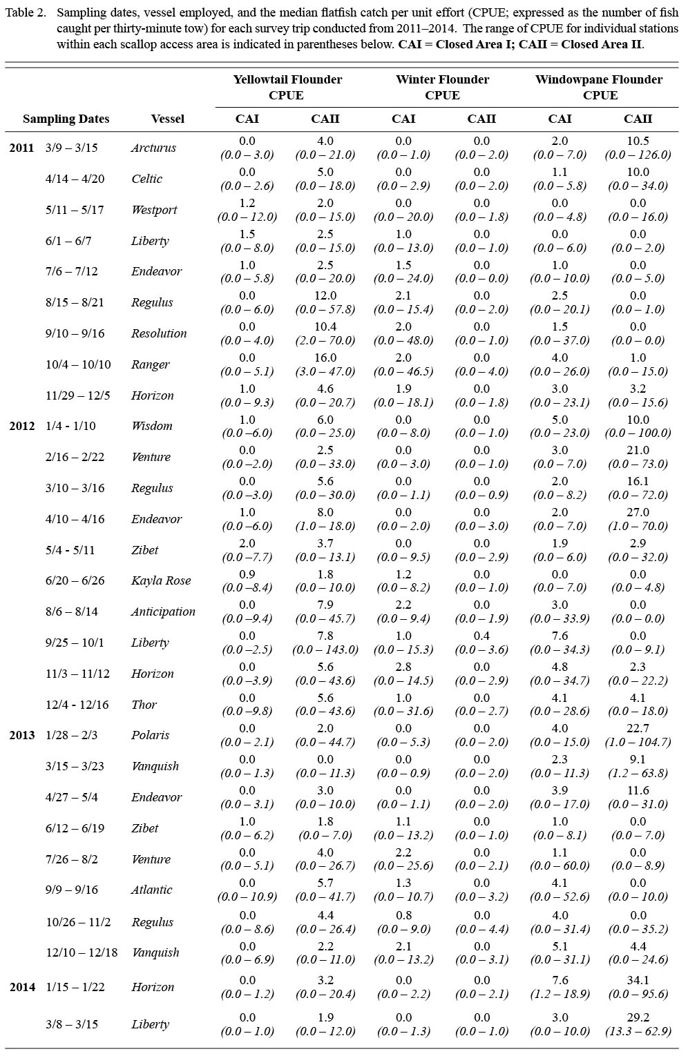 A total of 1 706 valid tows were completed from March 2011 to March 2014 (Table 2). Over the 29 survey trips, a total of 6 852 yellowtail flounder, 1 754 winter flounder, and 12 202 windowpane flounder were collected in the TDD. Catches of all three flounder species varied substantially between areas and seasons (Table 2; Fig. 2). Yellowtail and windowpane flounder catches were generally higher in CAII, with the greatest number of yellowtail caught in the fall and windowpane in the winter and spring (Fig. 2). Winter flounder catches were generally low throughout the year in both areas, but were highest in CAI in the summer and fall (Fig. 2). Yellowtail CPUE ranged from 0.0 to 12.0 in CAI and 0.0 to 143.0 in CAII. The CPUE of winter flounder and windowpane ranged from 0.0 to 48.0 and from 0.0 to 60.0 in CAI, respectively. In CAII, CPUE of winter flounder ranged from 0.0 to 4.4 and windowpane from 0.0 to 126.0.