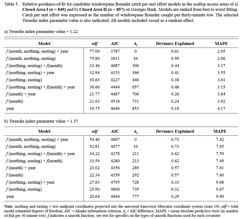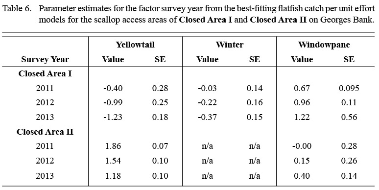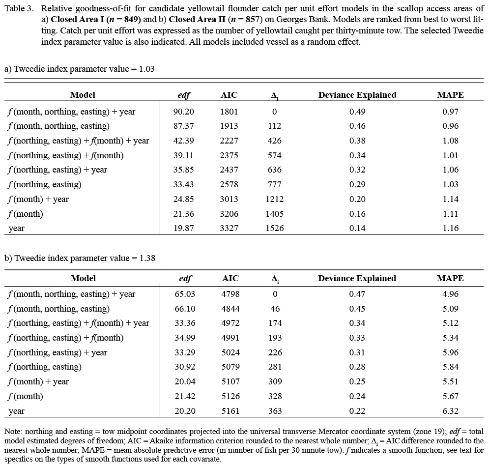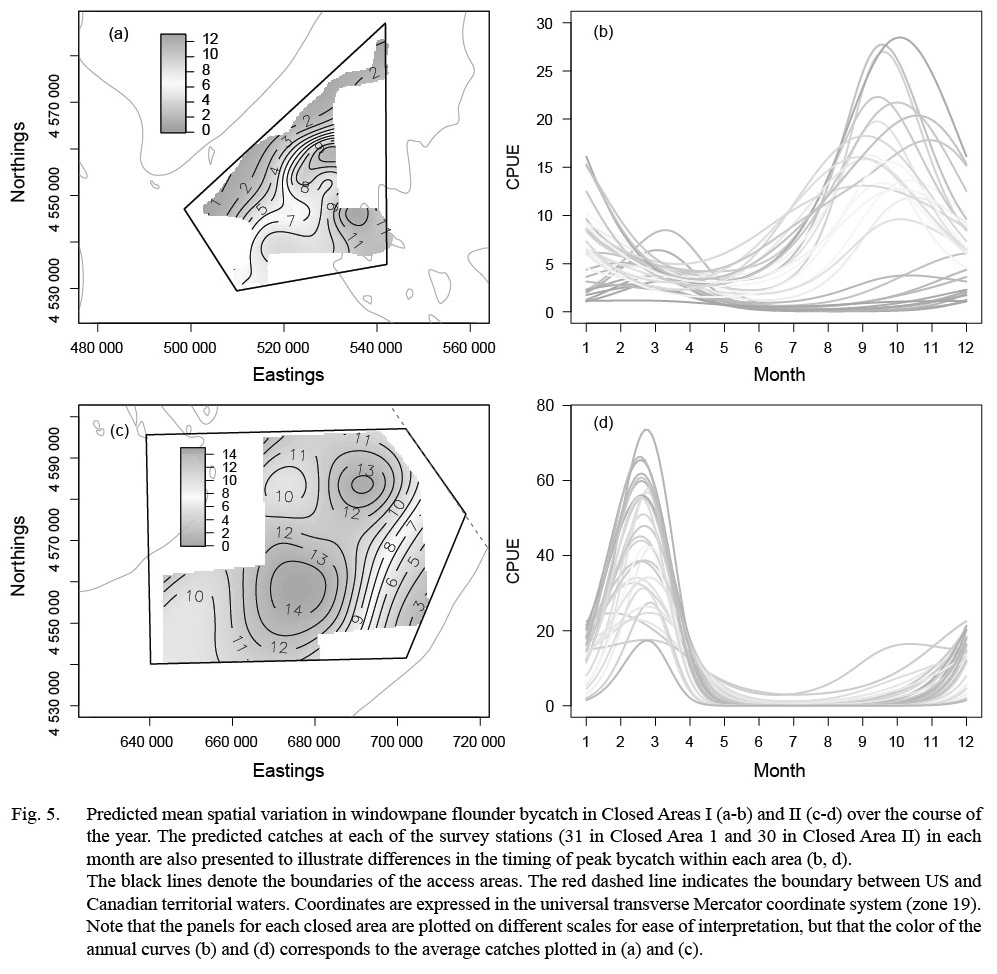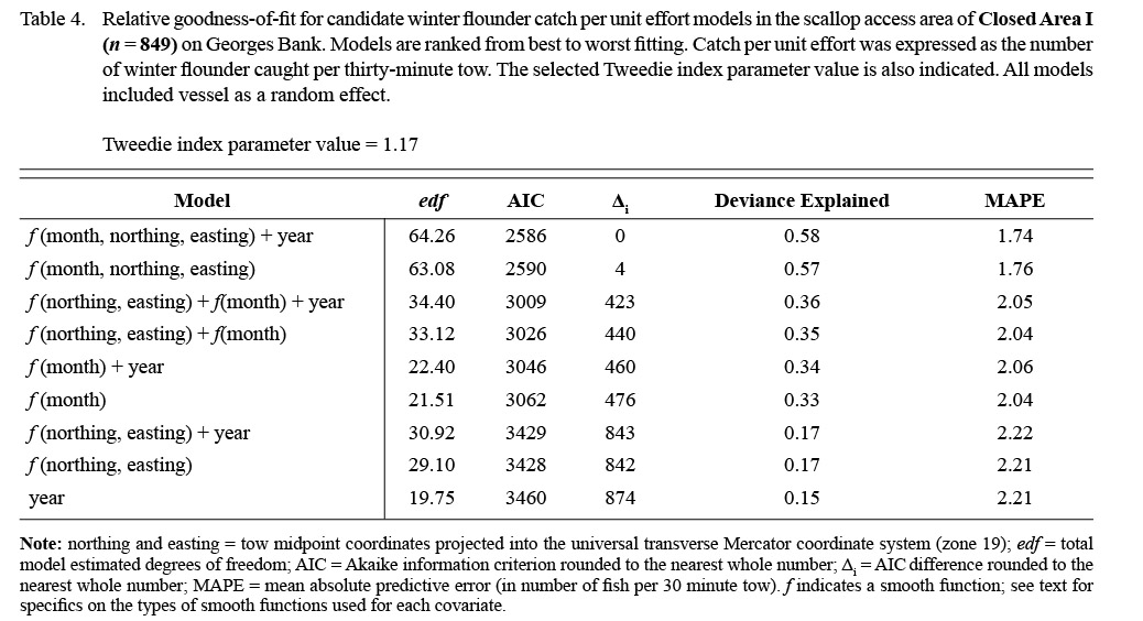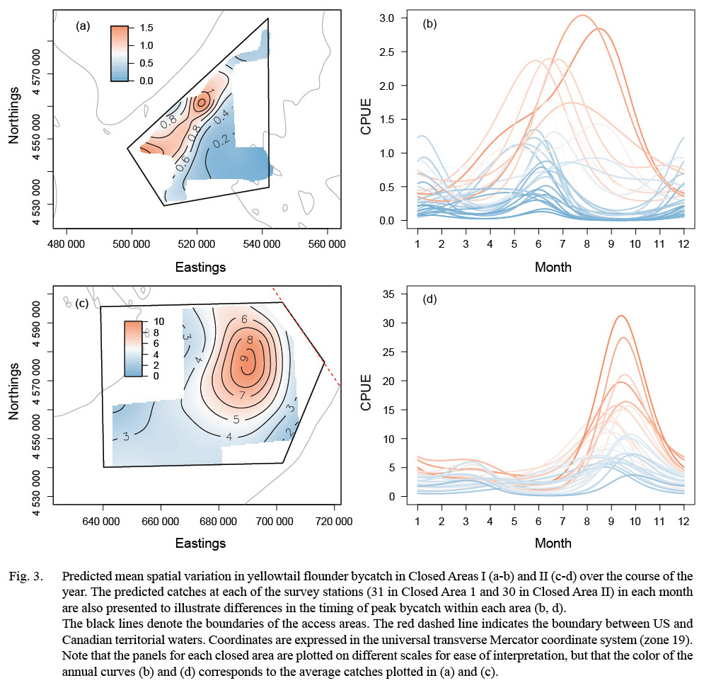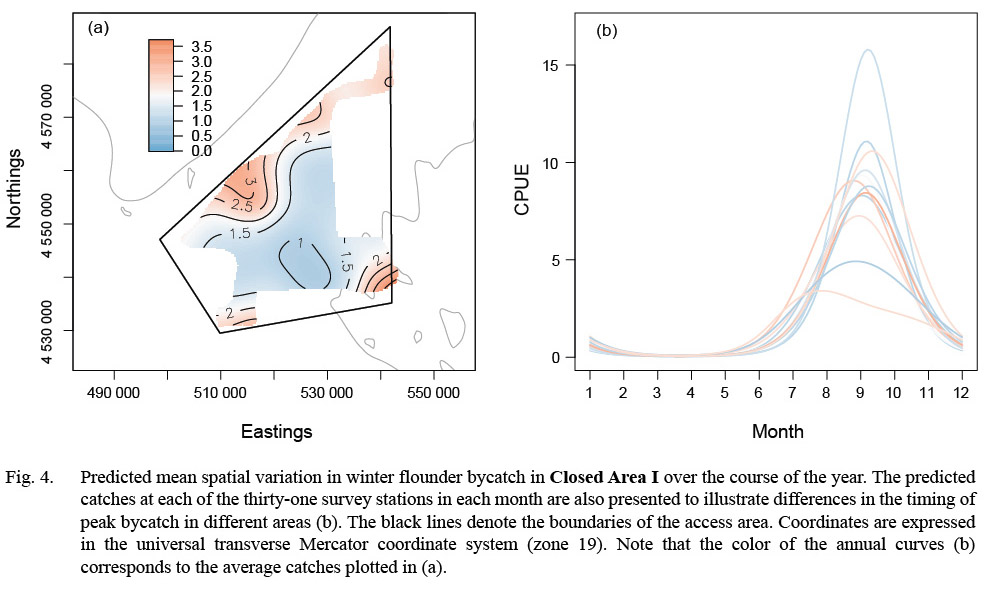 To collect the fine-scale, fishery-independent information needed to better understand the spatial and temporal dynamics of flatfish bycatch in the sea scallop fishery in Closed Areas I and II on Georges Bank, a seasonal dredge survey was conducted from 2011–2014. Generalized additive mixed models (Wood, 2006, 2011), which provide a flexible framework for the investigation of spatially continuous, non-linear trends (Swartzman et al., 1992; Augustin et al., 2013), were used to identify spatiotemporal patterns in flatfish bycatch rates. The results are considered in the context of possible time-area management strategies for the Georges Bank scallop access areas.