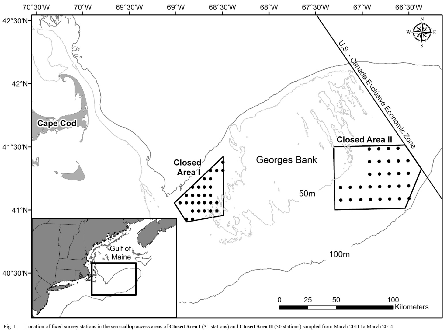 Twenty-nine survey trips were conducted aboard eighteen commercial sea scallop vessels from 2011 to 2014. Survey trips were conducted monthly from March through November of 2011, and every six weeks from January 2012 to March 2014. Sampling locations in Closed Area I and Closed Area II were selected using a fixed station, systematic grid design to ensure uniform spatial coverage of each area (Fig. 1). However, some portions of each closed area could not be sampled due to bottom type (e.g. rocky substrate) or high densities of sand dollars (Echinarachnius parma. In order to evenly distribute sampling effort to areas with different spatial extents, the distance between stations in each area varied. In Closed Area I (CAI), the 31 stations were separated by 5.4 km east to west and 7.2 km north to south. The 30 stations in Closed Area II (CAII) were separated by 8.6 km east to west and 11.1 km north to south.