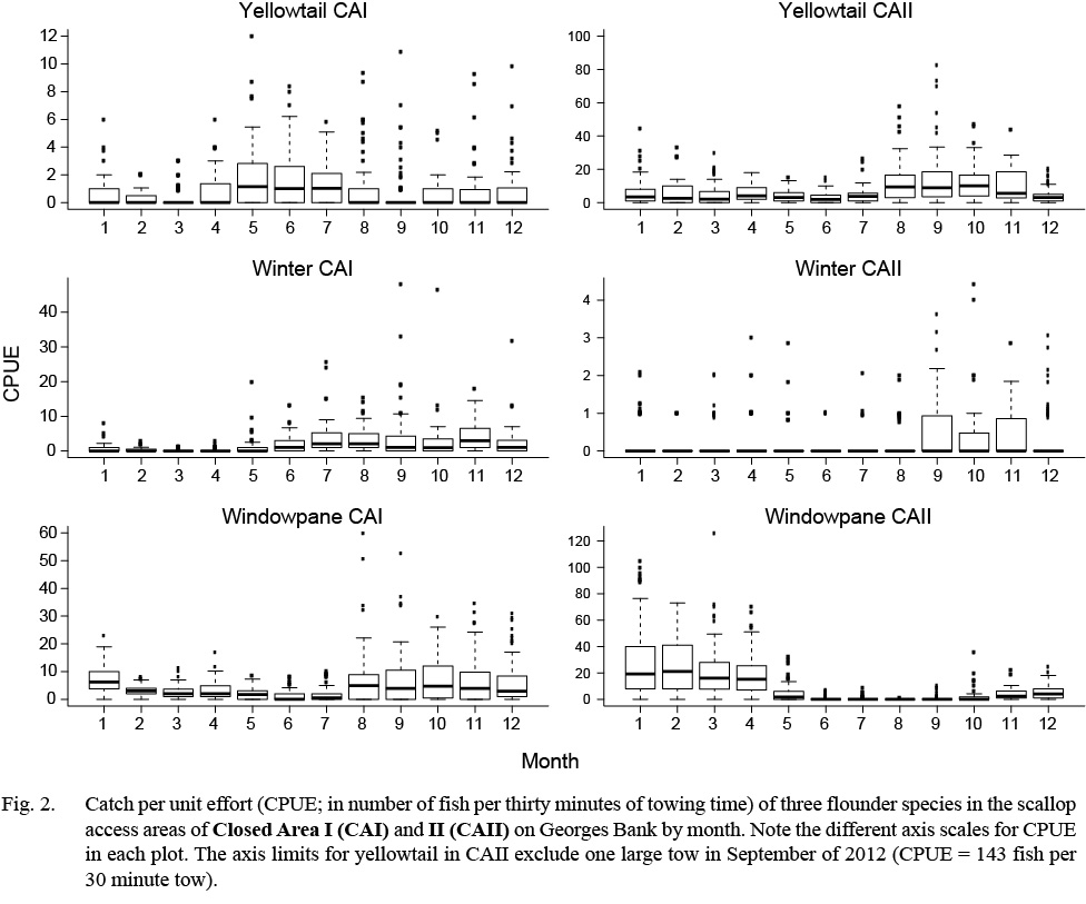 Whatever the driving mechanisms may be, the spatio-temporal patterns of flatfish bycatch documented herein may be useful in terms of optimizing the harvest of sea scallops while avoiding bycatch, and hence accountability measures, in the Atlantic sea scallop fishery on Georges Bank. It is important to note that our results are only suggestive of relative trends in the availability of flatfish species to the scallop fishery, and are not necessarily related to actual trends in abundance in the two areas surveyed, particularly given the potential impact of large tows on estimated trends (Maunder et al., 2006). However, our results do suggest that predictable seasonal patterns in flatfish bycatch may provide a practical foundation for the formulation of effective time-area management strategies. Based in part on the survey results reported herein, CAII is now closed to the scallop fleet from August through November (NEFMC, MS 2013) in an effort to reduce high rates of yellowtail bycatch.