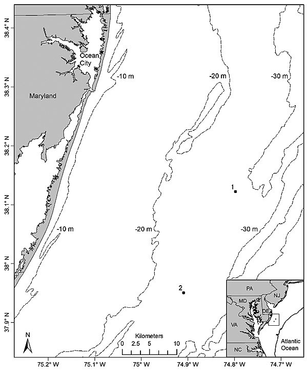 Sampling took place on 8 days from 4 July to 3 August 2012 at 2 sites located off the Maryland coast (Fig. 1). To compare underwater video and hook-and-line gears for sampling black sea bass, 2 sites (separated by 20.3 km) were chosen based on their types of bottom habitat. Site 1 (37°59′14″N, 74°54′30″W) was characterized by a sandy bottom with mud, shell, gravel, and aggregations of small to large cobbles and was classified as an unstructured site. In contrast, site 2 (38°09′09″N, 74°47′41″W) was classified as highly structured since it consisted of a mixture of sand, mud, cobbles, large rocks, and low relief hard bottom habitat [i.e. rocky outcroppings and boulders or other structures partly covered with sea whips (Leptogorgia spp.) and stony corals]. The choice of sites (i.e. site 1 = unstructured; site 2 = structured) allowed for a simultaneous comparison of the two gears for sampling black sea bass on variable habitats with presumed differences in fish densities. Sites were visited separately on alternate days for a total of 4 times each during the study period. Sampling took place during daylight hours from 0900 to 1600 Eastern Daylight Savings Time at depths ranging from 29 m to 31 m at both sites. Bottom water temperatures varied from 12.8°C to 14.4°C and 11.7°C to 14.6°C at site 1 and site 2, respectively.