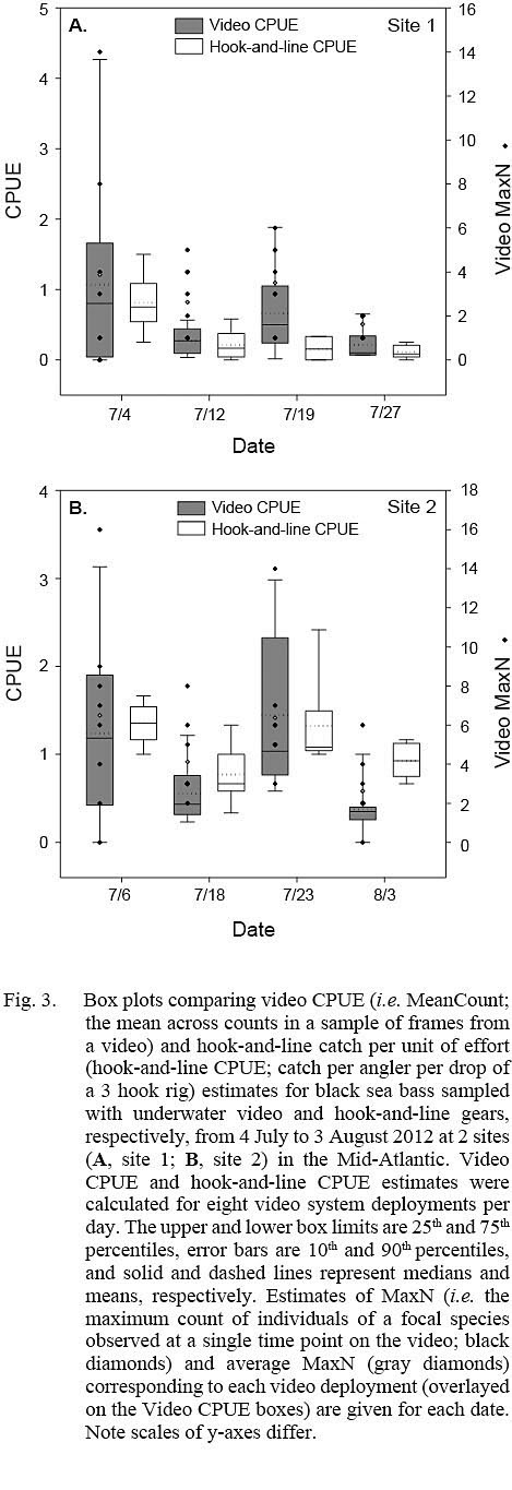 In conclusion, our results indicated that both gear types were capable of sampling the same depths and were able to detect differences in abundance estimates over a small temporal and spatial scale though each had its own advantages and limitations with regard to sampling black sea bass. For example, our single unbaited video system was simple and relatively inexpensive to build, easy to deploy and haul from depth, needed little maintenance or attention while sampling, and provided a way to obtain direct video observations of fish behavior and bottom habitats. However, processing videos and recording fish observations in the laboratory was time consuming and required large amounts data storage space. In contrast, sampling with hook-and-line gear was easy to implement with low-cost equipment and produced less variable abundance estimates but required fresh bait and multiple individuals to sample and record catch information. Hook-and-line sampling also afforded the option of collecting fish size information and biological samples but occasionally caused mortality due to deep hooking and/or barotrauma (Bugley and Shepherd, 1991). Considering the strengths of each gear type, it is recommended that both be used in combination when sampling black sea bass on a range of inshore habitats. Similarly, the sampling limitations of each gear, including the effects of cloud cover and current velocity, provide further evidence that their combined use for sampling black sea bass is warranted. Underwater video could overcome the effects of decreased bottom exposure time of bait due to increased current velocity or wind speed during hook-and-line sampling. In contrast, hook-and-line sampling could provide estimates of CPUE when cloud cover or water turbidly limits bottom lighting and visibility during video system deployments. However, despite the benefits of combined sampling, additional studies are needed to evaluate the sampling efficiencies of both gear types over greater temporal and spatial scales to determine if either could be employed as a survey tool for assessing black sea bass abundance in Mid-Atlantic waters. With larger sample sizes, future studies could evaluate the power of each gear’s ability to detect changes (e.g. minimum % change, effect size % increase or decrease) in CPUE estimates over space and time as well as between locations with different bottom habitats (Willis et al., 2003; Bennett et al., 2009; Harvey et al., 2012).
