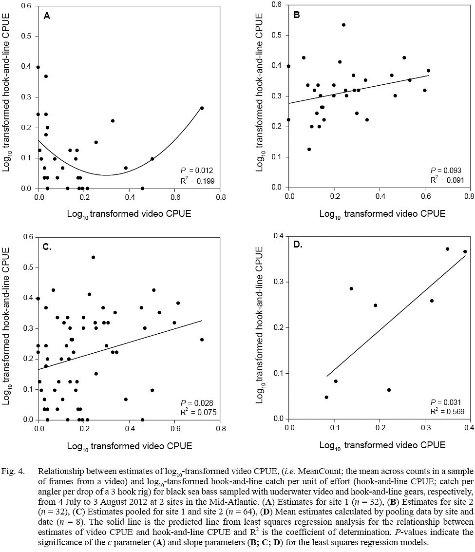 Evidence of a non-linear relationship, indicated by a significant P value for the c parameter, between video CPUE and hook-and-line CPUE estimates was found only for site 1 data (quadratic model; parameter estimate ± standard error, a = 1.279 ± 0.478, b = -0.767 ± 0.299, c = 0.159 ± 0.030; P <0.05, R2= 0.199) (Fig. 4). Positive linear relationships were found for the site 2 data (linear model; slope ± standard error = 0.149 ± 0.056, P = 0.093, R2 = 0.091), pooled data (site 1 + site 2; linear model; slope ± standard error = 0.223 ± 0.099, P = 0.028, R2 = 0.075), and data averaged by site and date (linear model; slope ± standard error = 0.867 ± 0.308, P = 0.031, R2 = 0.569) (Fig. 4).