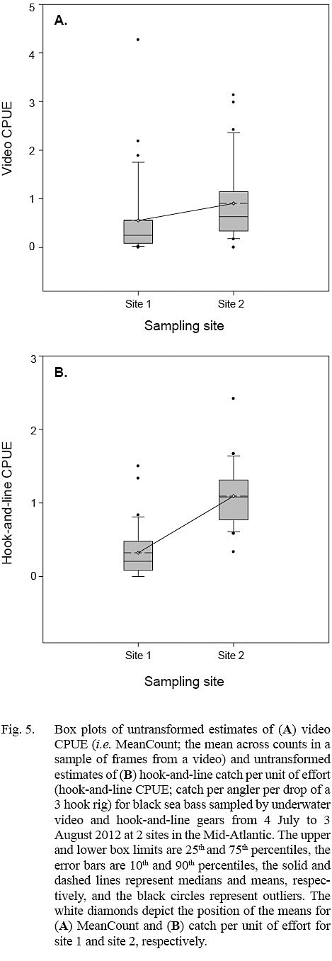 A total of 64 (n = 32) video system deployments and 768 (n = 384 per site) hook rig drops were made during the study period. Estimates of CPUE (hereafter referred to as hook-and-line CPUE) for black sea bass sampled with hook-and-line gear were calculated as the number of fish caught per 3 min drop of a 3 hook rig. Values were averaged across the three fishers to obtain a single hook-and-line CPUE value corresponding to each video system deployment (n = 32 for each site; n = 8 per day).