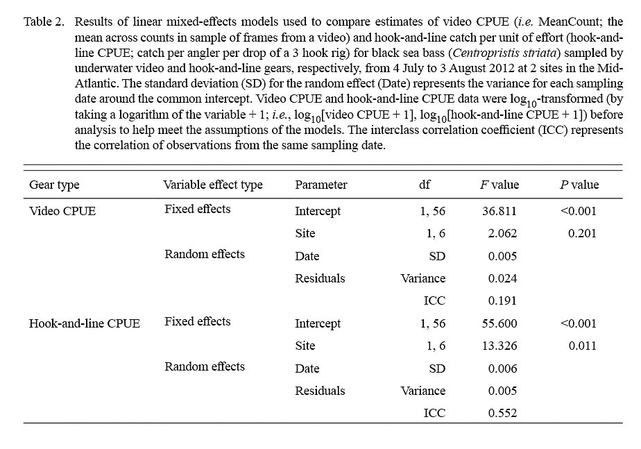 Lastly, linear mixed-effects models were used to test for differences in estimates of video CPUE between sampling sites and estimates of hook-and-line CPUE between sampling sites (Cullen and Stevens, 2017). Models included log10-transformed video CPUE (i.e. log10[video CPUE + 1]) or log10-transformed hook-and-line CPUE (i.e. log10[hook-and-line CPUE + 1]) as the response variable, site as a fixed effect, and sampling date as a random effect because multiple non-independent video system deployments and hook rig drops were conducted on each sampling date. Linear mixed-effects models were fitted with restricted maximum likelihood using the ‘nlme’ (Pinheiro et al., 2018) package in RStudio (RStudio Team, 2018). Analysis of variance was used to extract the F values and Wald test P values for the fixed effect (i.e. sampling site) (Cullen and Stevens, 2017).
