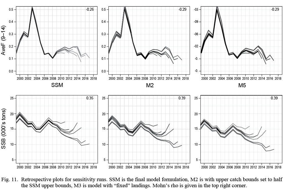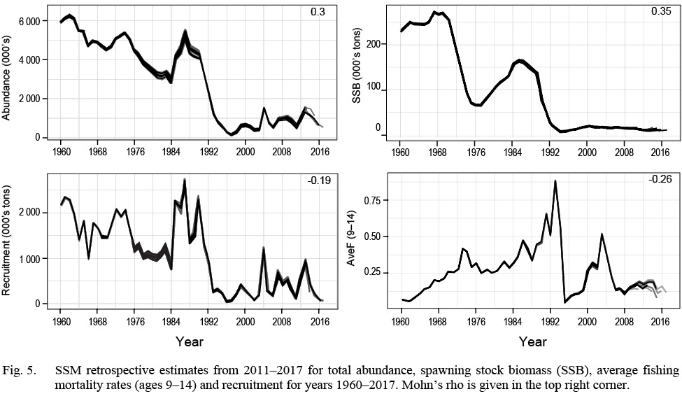 The SSM fit was also assessed through retrospective model fitting for the years 2011–2017. Each retrospective model fit used one less year of data (i.e. model for year 2011 used data up to 2011) and predicted abundance, biomass, spawning stock biomass and average F’s were examined for systematic patterns and the severity of retrospective pattern was assessed using Mohn’s rho (see Mohn, 1999). Ideally, no discernable directional patterns will be present in the retrospective plots.