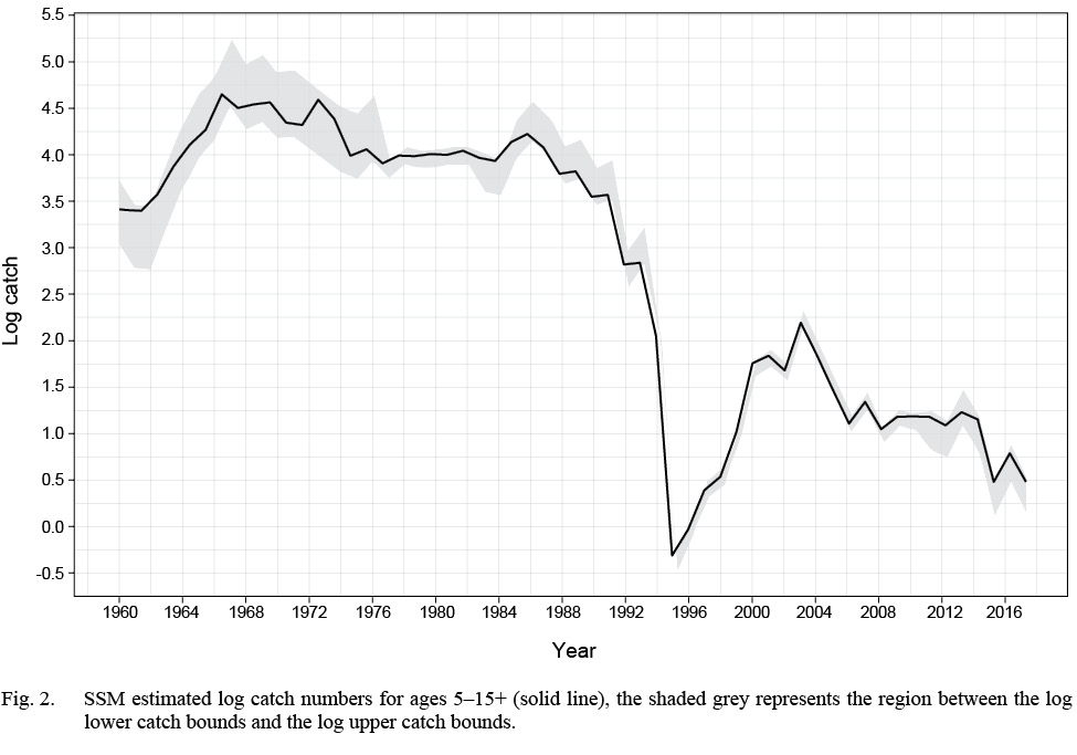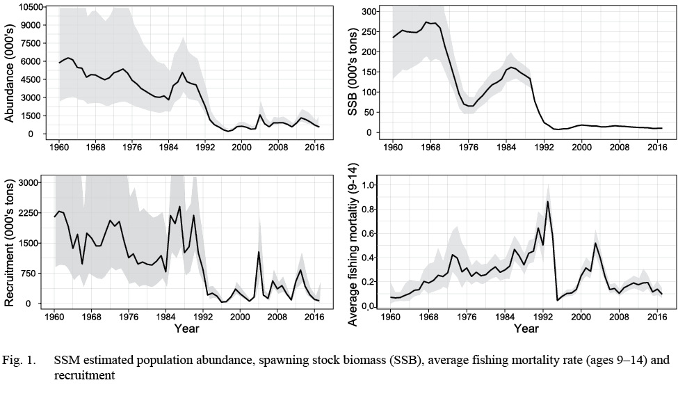 Cadigan, N. G. 2015. A state-space stock assessment model for northern cod, including under-reported catches and variable natural mortality rates.Canadian Journal of Fisheries and Aquatic Sciences, 73(2): 296–308. https://doi.org/10.1139/cjfas-2015-0047