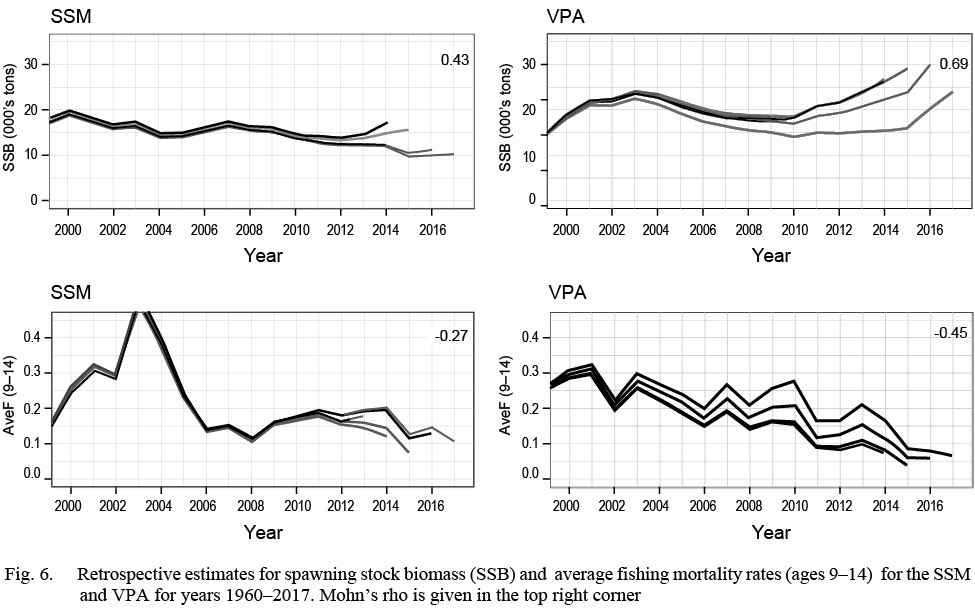 Mohn’s rho from the SSM retrospective analyses for both aveF and SSB were closer to zero than Mohn’s rho from the VPA retrospective analysis, which is a key improvement compared to the current assessment model. Including process error in the population dynamics model helped account for underlying time-varying population processes (e.g. M) that were not accounted for in the VPA, thereby reducing retrospective patterns. There is still evidence of slight retrospective patterns, and this may be caused by underlying spatial or time-varying processes that are mis-specified in the observation model since process errors can only account for misspecifications in the process equations.