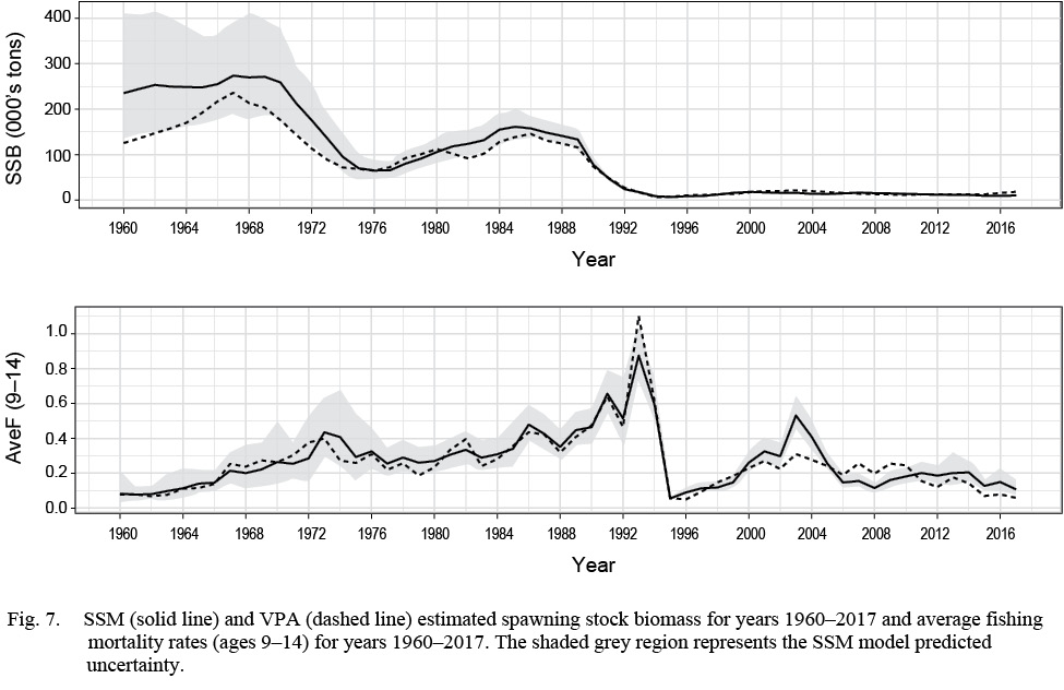 The overall trends in SSB and aveF were similar for the SSM and the VPA (Fig. 7). Noticeable differences included the SSM predictions of historical SSB (i.e. years 1960–1972) that were larger (but with high uncertainty) than the historical SSB predictions from the VPA. The VPA model also predicted a higher average fishing mortality rate in the early 1990s, at approximately 1.1, with the SSM prediction at approximately 0.80 for the same period.
