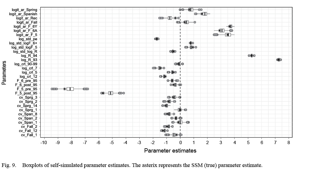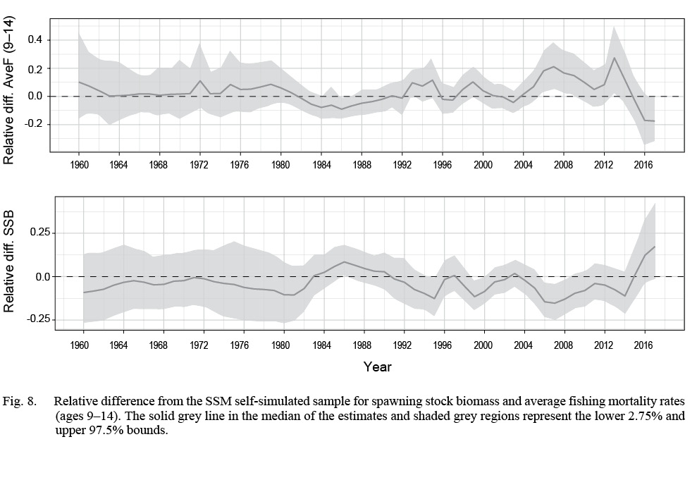 The self-simulation study lower 2.5% and upper 97.5% did not cover zero for years 2006–2010 and again in 2013–2015. This bias was also present in models O1 (fixing all crl and F AR(1) parameters) and O2 (freely estimating all AR(1) parameters; (see Supplementary Materials 4). In a self-test simulation the model is specified exactly so stock size estimation bias cannot be the result of model misspecification, but rather it must be related to estimation bias and possibly related to nonlinear modelling of random effects. Our self-simulation run that implemented the TMB bias correction option had larger bias than the SSM self-simulation run without (see Supplementary Materials 4), which provides evidence that the bias is related to estimation bias. Also, preliminary research that fit the SSM with an increase in M (both across the entire time series, and another run increasing M only in the later years) did not produce the self-simulation bias in SSB and aveF in these later years (see Supplementary Materials 4). Hence, it seems that the bias is related to the particular settings of the model, and perhaps the magnitude of variance parameter estimates, and this requires additional research to better understand this type of bias.