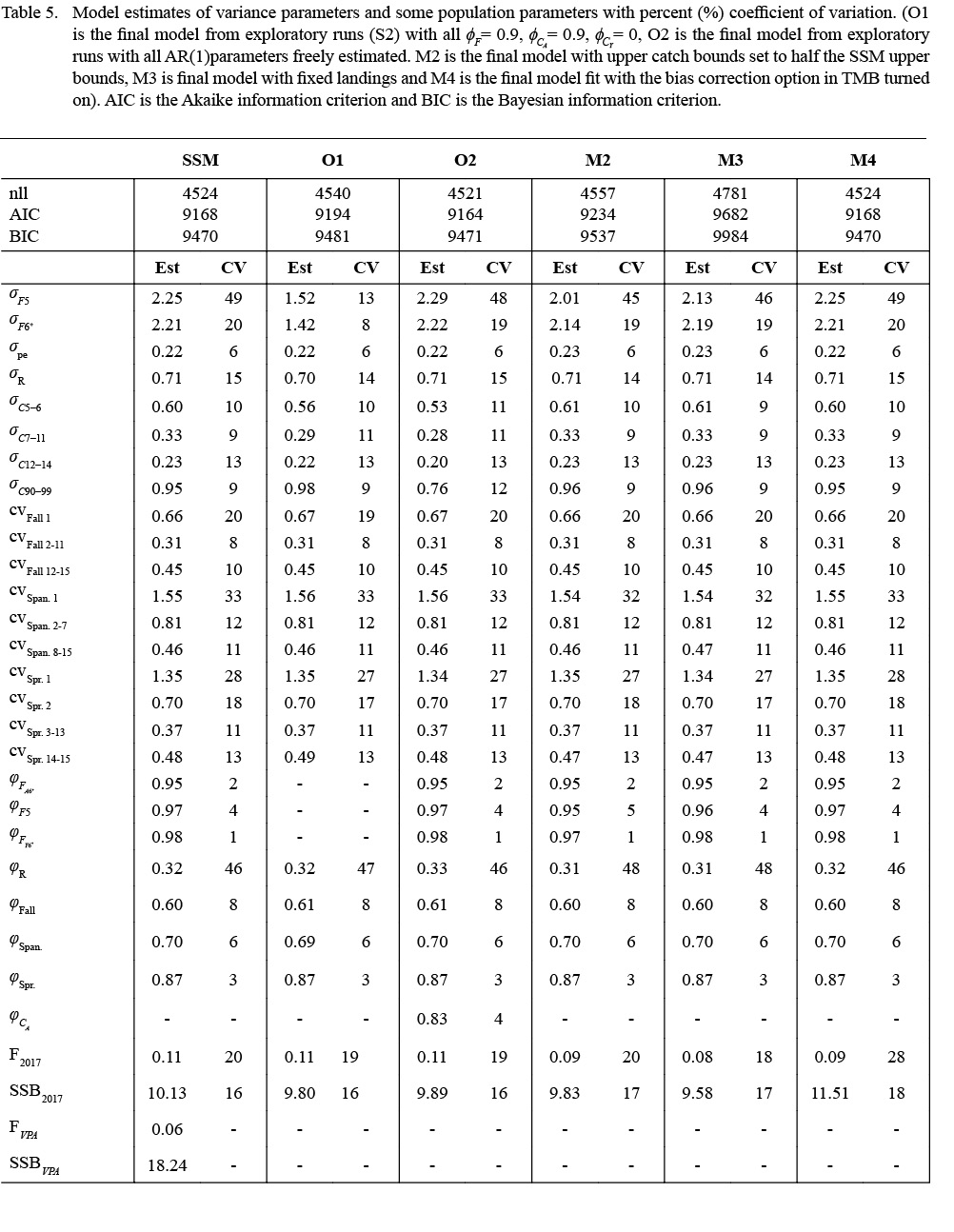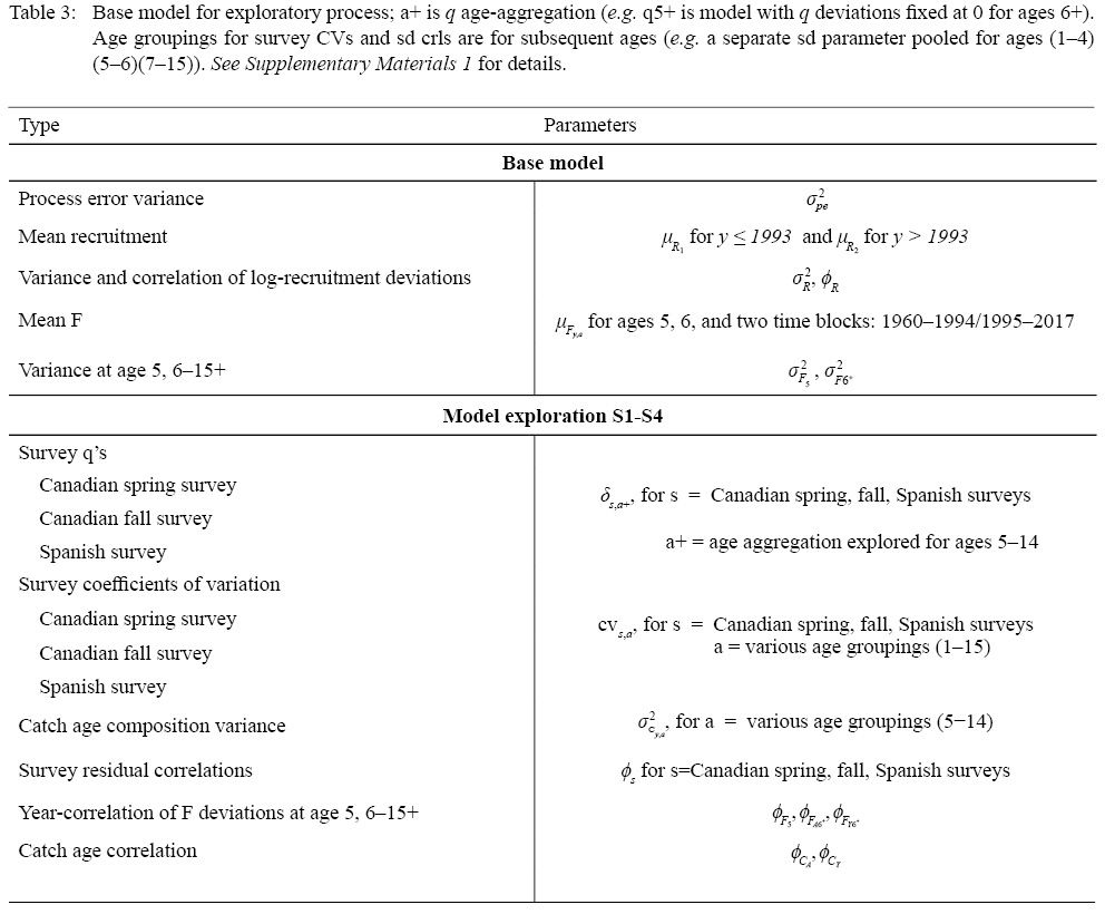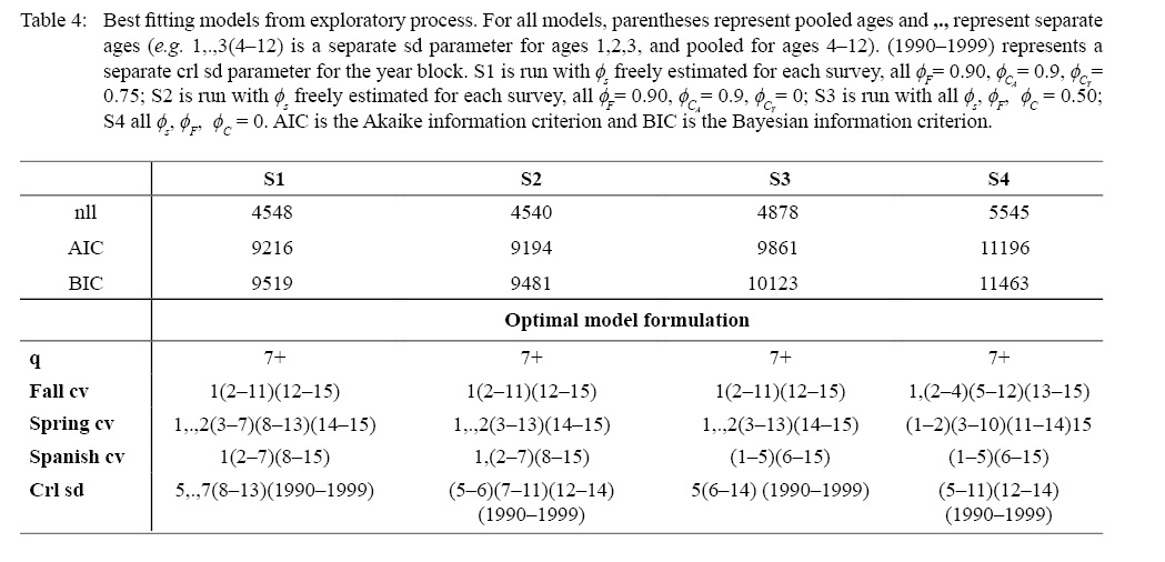 The final model formulation was determined via a thorough exploratory process. The overall goal of the exploratory process was to determine the best model formulation for the survey CVs, the crl σ C y,a 2 (sds) and the q age-aggregating (detailed below). The Bayesian information criterion (BIC) was used in model selection since BIC penalizes more heavily for extra parameters when the sample size is large. Previous work has shown that the correlation parameters can be difficult to estimate reliably (see, e.g., Johnson et al., 2016; Xu et al., 2019), thus for our exploratory process, we conducted four exploratory runs with fixed AR(1) parameters: S1) ϕ s freely estimated for each survey, all ϕ F= 0.90, ϕ C A= 0.9, ϕ C Y= 0.75; S2) ϕ s freely estimated for each survey, all ϕ F= 0.90, ϕ C A= 0.9, ϕ C Y= 0; S3) all ϕ s, ϕ F, ϕ C = 0.50; S4) all ϕ s, ϕ F, ϕ C = 0. In all cases, the exploratory process began with the simplest model: with one sd parameter estimated for the crls, and one CV parameter per survey <(see Table 3) and followed the 6 steps below. Within each step, the model was refit for each assumption (e.g. in step 1 the model was refit 10 times, for q age-aggregating 5,..,14):