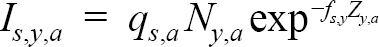 where f represents the fraction of the year the survey takes place (0.460 for the Canadian spring and Spanish surveys and 0.875 for the Canadian fall survey). As in our treatment of the fishing mortality rates, we model the survey catchabilities, q s,a, as increasing with age for each survey: