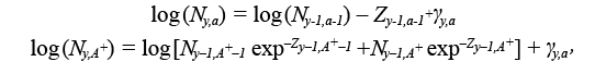 The model runs for the years y = 1960, ..., 2017 and for ages a = 1, ..., 15 +, where 15 + represents the oldest ages grouped together from ages 15 onwards, called the plus group (see Table 1 for model equations). For simplicity, we will refer to model ages a = 1, ..., A +, and years y = 1, ..., Y. The process model describes how the abundance at age a in year y (i.e. N y,a) and the fishing mortality, F y,a change over time. The N y,a for all ages and years are treated as random effects, with the cohort abundance model modelled as: