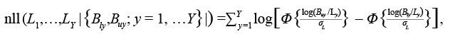 Dwyer et al. (2016) reported uncertainties about the reliability of the landings data for Grand Bank American plaice. To account for this, we treat reported landings as a lower bound for true landings (i.e. not all catches are reported). We assume that there is an upper bound for landings that varies with the reliability of data (see Table 2 for details). We used a censored likelihood approach in which the bounds are treated as the only information about landings (see e.g. Hammond and Trenkel, 2005; Bousquet et al., 2010; Cadigan, 2015; Van Beveren et al., 2017). We assume the true landings could be accurately estimated with a CV of 5%. Let <Bly and Buy denote the lower and upper bounds and σ L = 0.05. The negative loglikelihood (nll) for the landings bounds data is: