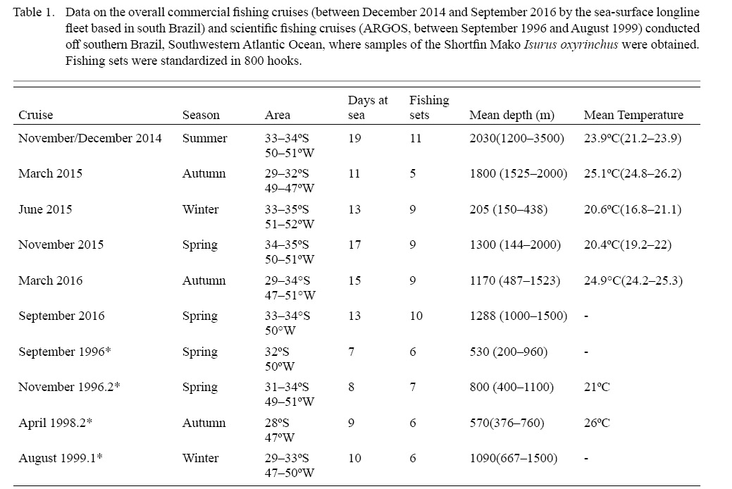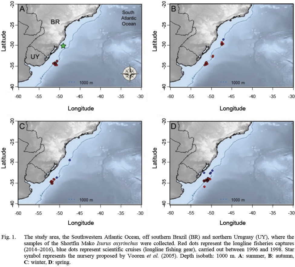 For the collection of specimens of et al. I. oxyrinchus on board the fishing vessels, permission of the Instituto Chico Mendes de Conservação da Biodiversidade (ICMBio) and Sistema de Autorização e Informação em Biodiversidade (SISBIO) was requested, license number 45279-1. This research is part of the research project “The biology and conservation of shark populations in the extreme south of Brazil” registered at the Universidade Federal do Rio Grande under process number 814440/2014, with awareness of the Ethics Committee in Animal Use (Comissão de Ética Em Uso Animal – CEUA of the same university. No experimental work was undertaken with the specimens collected.