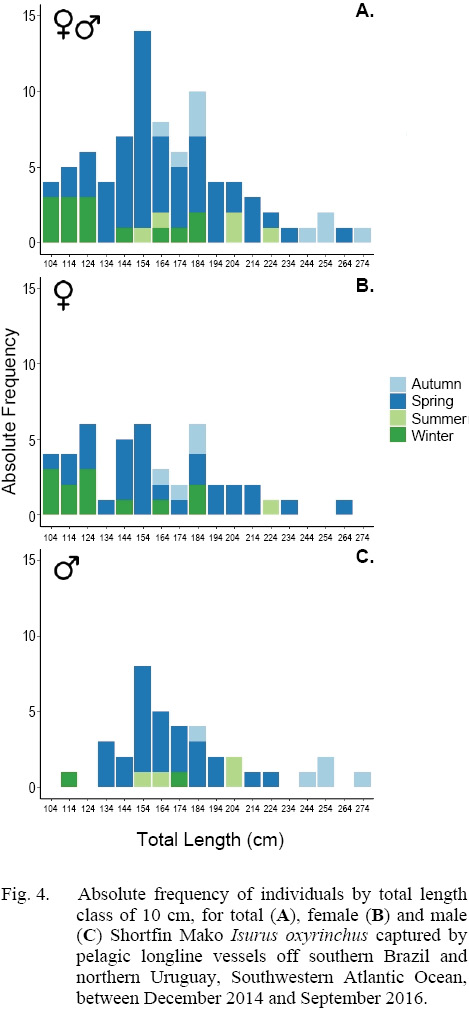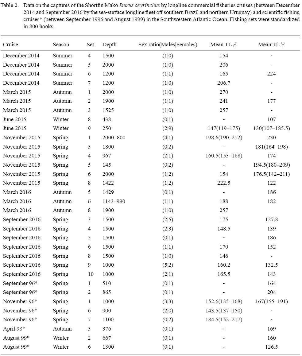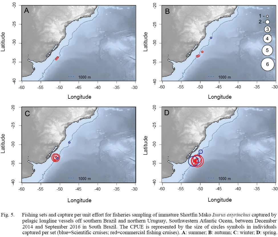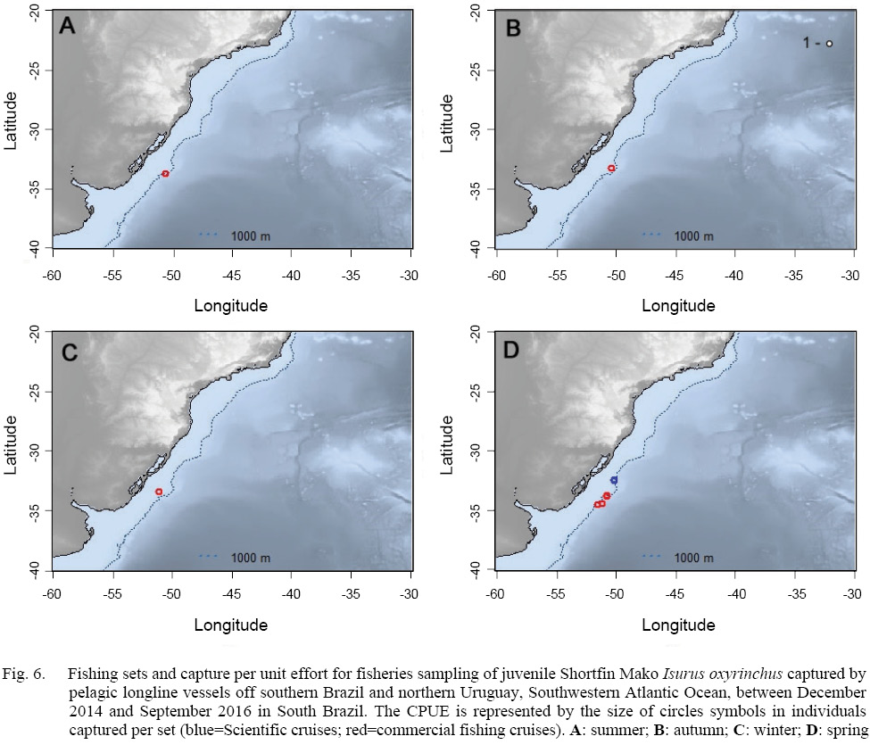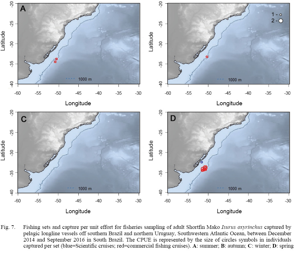 Stevens (2008) stated that, in spite of being commonly captured, the biology of this species is still not well understood. The economical and ecological importance of the species, the apparent declining populations trend, lack of reproductive studies in the Southwest Atlantic, discrepancies among studies and differences among populations of the Shortfin Mako highlight the need to acquire fishing and reproductive biology information for this species. The aim of this study was to study the reproductive biology of et al. Isurus oxyrinchus captured by the south Brazilian surface longline commercial fleet in the Southwest Atlantic Ocean, and to provide data on CPUE and size distribution by sex. Here, we present population structure data, average size per season sampled and reproductive parameters.