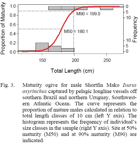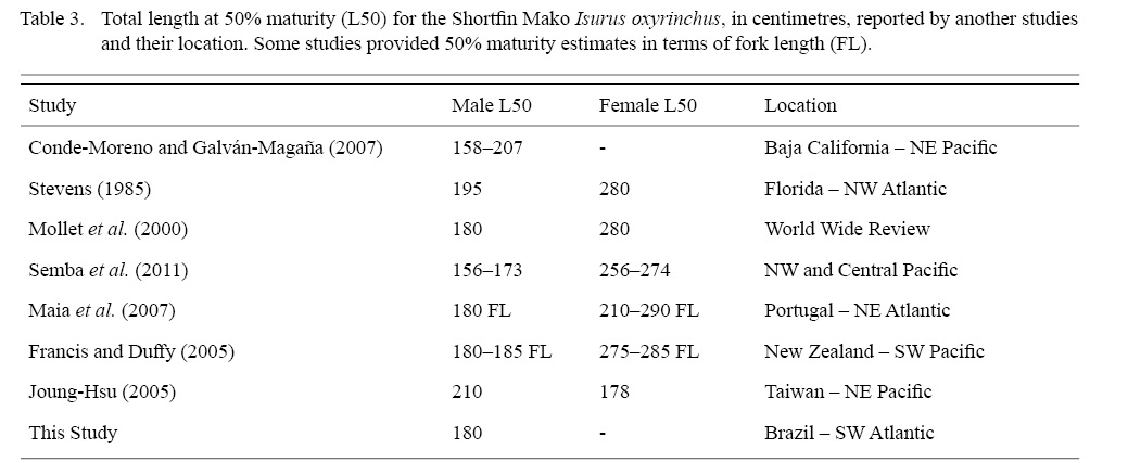 Shortfin Mako size at sexual maturity ranges between 156 and 210 cm for males and between 256 and 285 cm for females, with great variation among regions and studies (Mollet et al. , 2000; Joung and Hsu 2005; Semba et al., 2011, see Table 3 for details). Regardless of the growing amount of information on biology and reproductive parameters of the Shortfin Mako in the last 30 years, there is still a considerable lack of information about this species, as for most of Lamniformes (Gilmore 1993, 2005; Mollet et al. , 2000). Moreover, size at maturity estimates for male Shortfin Mako were not available for the South West Atlantic.