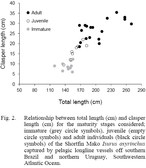 To assess sexual maturity, criteria proposed by Semba et al. (2011) for the shortfin mako shark were applied. To determine maturity in males, the calcification and mobility of the clasper were examined, and maturity was as follows: stage 1-immature (not calcified claspers); stage 2-juvenile (semi-rigid and calcified claspers with low mobility (clasper rotation forward along the caudal-cephalic body axis) and no spurs) and stage 3-adult (calcified, high mobility, spurs).
