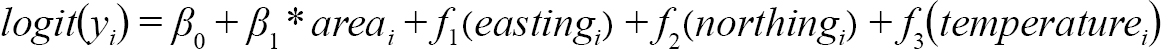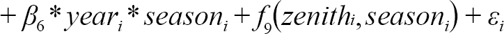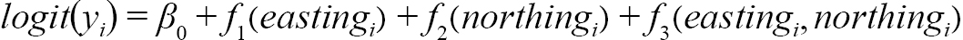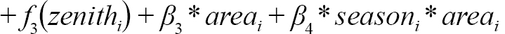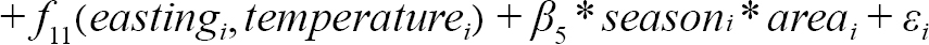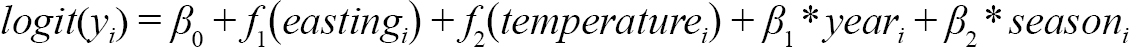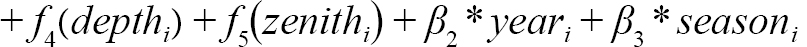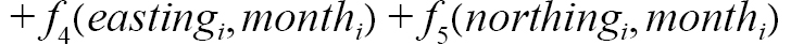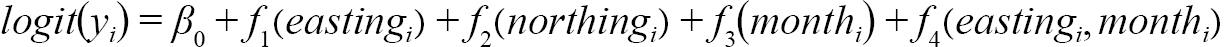 where notation is as above except that the error term (ε) is beta distributed. We used thin plate regression splines for all one-dimensional smooth terms and tensor product smooths for all two-dimensional smooth terms (comprised of cyclic cubic regression splines for month interactions and thin plate regression splines for all other variables) in all models.